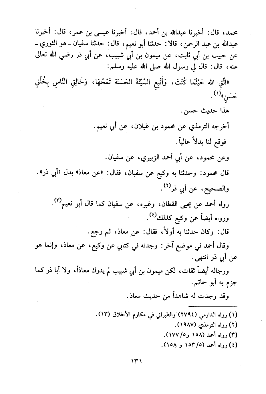 مُحَمَّدٍ قَالَ أَخْبَرَنَا عَبْدُ اللَّهِ بْنُ أَحْمَدَ قَالَ أَخْبَرَنَا عِيسَى بْنِ عُمَرَ قَالَ أَخْبَرَنَا عَبْدُ اللَّهِ بْنُ عَبْدِ الرَّحْمَنِ قَالَا حَدَّثَنَا أَبُو نُعَيْمٍ قَالَ حَدَّثَنَا سُفْيَانُ هُوَ الثَّوْرِيُّ عَنْ حَبِيبِ بْنِ أَبِي ثَابِتٍ عَنْ مَيْمُونِ بْنِ أَبِي شُبَيْبٍ عَنْ أَبِي ذِرٍ رَضِيَ اللَّهُ تَعَالَى عَنْهُ قَالَ قَالَ لي رَسُولُ اللَّهِ صَلَّى اللَّهُ عَلَيْهِ وَسَلَّمَ اتَّقِ اللَّهَ حَيْثُمَا كُنْتَ وَأَتْبِعِ السَّيِّئَةَ الْحَسَنَة تَمْحُهَا وَخَالِقِ النَّاسَ بِخُلُقٍ حَسَنٍ