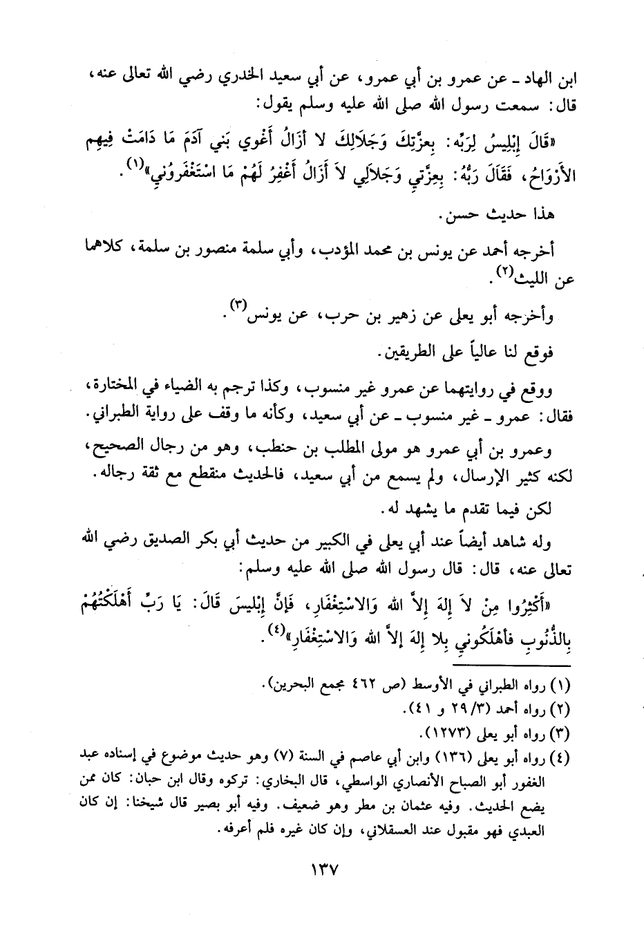 ابْنَ الْهَادِ عَنْ عَمْرِو بْنِ أَبِي عَمْرٍو عَنْ أَبِي سَعِيدٍ الْخُدَّرِيِّ رَضِيَ اللَّهُ تَعَالَى عَنْهُ قَالَ سَمِعْتُ رَسُولَ اللَّهِ صَلَّى اللَّهُ عَلَيْهِ وَسَلَّمَ يَقُولُ قَالَ إِبْلِيسُ لِرَبِّهِ بِعِزَّتِكَ وَجَلَالِكَ لَا أَزَالُ أَغْوي بَنِي آدَمَ مَا دَامَتْ فِيهِم الْأَرْوَاحُ فَقَالَ رَبُّهُ بِعِزَّتِيِ وَجَلَالِي لَا أَزَالُ أَغْفِرُ لَهُمْ مَا اسْتَغْفَروُنِي