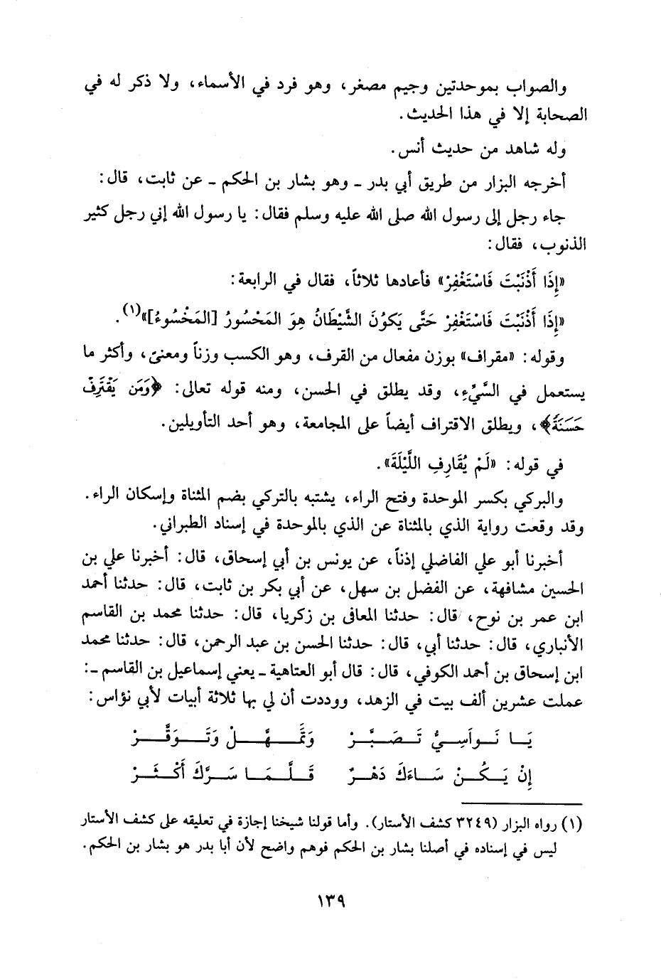 أَخْرَجَهُ الْبَزَّارُ مِنْ طَرِيقِ أَبِي بَدْرٍ وَهُوَ بَشَارُ بْنُ الْحَكَمِ عَنْ ثَابِتٍ قَالَ جَاءَ رَجُلٌ إِلَى رَسُولِ اللَّهِ صَلَّى اللَّهُ عَلَيْهِ وَسَلَّمَ فَقَالَ يَا رَسُولَ اللَّهِ إِنِّي رَجُلٌ كَثِيرُ الذُّنُوبِ فَقَالَ إِذَا أَذْنَبْتَ فَاسْتَغْفِرْ فَأَعَادَهَا ثَلَاثًا فَقَالَ فِي الرَّابِعَةِ إِذَا أَذْنَبْتَ فَاسْتَغْفِرْ حَتَّى يَكوُنَ الشَّيْطَانُ هِوَ الْمَحْسُورُ الْمَخْسُوءُ وَقَوْلِهِ مِقْرَافٌ بِوَزْنِ مِفْعَالٌ مِنَ الْقَرْفِ وَهُوَ الْكَسْبُ وَزْنًا وَمَعْنًى وَأكْثر مَا يسْتَعْمل فِي السيء وَقَدْ يُطْلَقُ فِي الْحَسَنِ وَمِنْهُ قَوْلِهِ تَعَالَى {وَمَنْ يَقْتَرِفْ حَسَنَةً} وَيُطْلَقُ الْاقْتِرَافُ أَيْضًا عَلَى الْمُجَامَعَةِ وَهُوَ أَحَدُ التَّأْوِيلَيْنِ فِي قَوْلِهِ لَمْ يُقَارِفِ اللَّيْلَةَ وَالْبِرَكِي بِكَسْرِ الْمُوَحَدَةِ وَفَتْحِ الرَّاءِ يَشْتَبِهُ بِالتُّرْكِي بِضَمِ الْمُثَنَاةِ وَإِسْكَانِ الرَّاءِ وَقَدْ وَقَعَتْ رِوَايَةُ الَّذِي بِالْمُثَنَاةِ عَنِ الَّذِي بِالْمُوَحَدَةِ فِي إِسْنَادِ الطَّبَرَانِيِّ