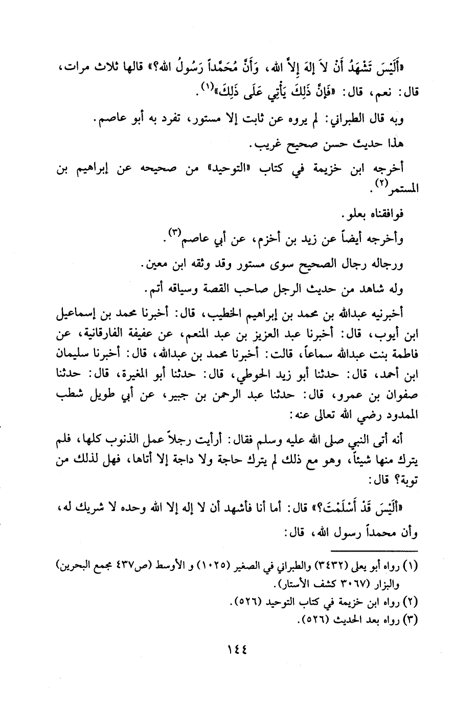 أَلَيْسَ تَشْهَدُ أَنْ لَا إِلهَ إِلَّا اللَّهَ وَأَنَّ مُحَمَّدًا رَسُولُ اللَّهِ قَالَهَا ثَلَاثَ مَرَاتٍ قَالَ نَعَمْ قَالَ 9 فَإنَّ ذَلِكَ يَأْتِي عَلَى ذَلِكَ وَبِهِ قَالَ الطَّبَرَانِيُّ لَمْ يَرْوِهِ عَنْ ثَابِتٍ إِلَّا مَسْتُورٌ تَفَرَّدَ بِهِ أَبُو عَاصِمٍ