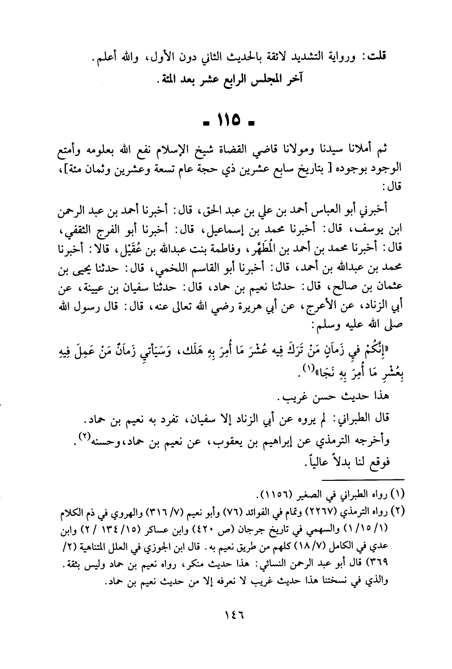 115 - ثمَّ أملانا سيدنَا ومولانا قَاضِي الْقُضَاة شيخ الْإِسْلَام نفع الله بِعُلُومِهِ وأمتع الْوُجُود بِوُجُودِهِ بتاريخ سَابِع عشْرين ذِي حجَّة عَام تِسْعَة وَعشْرين وثمان مئة قَالَ