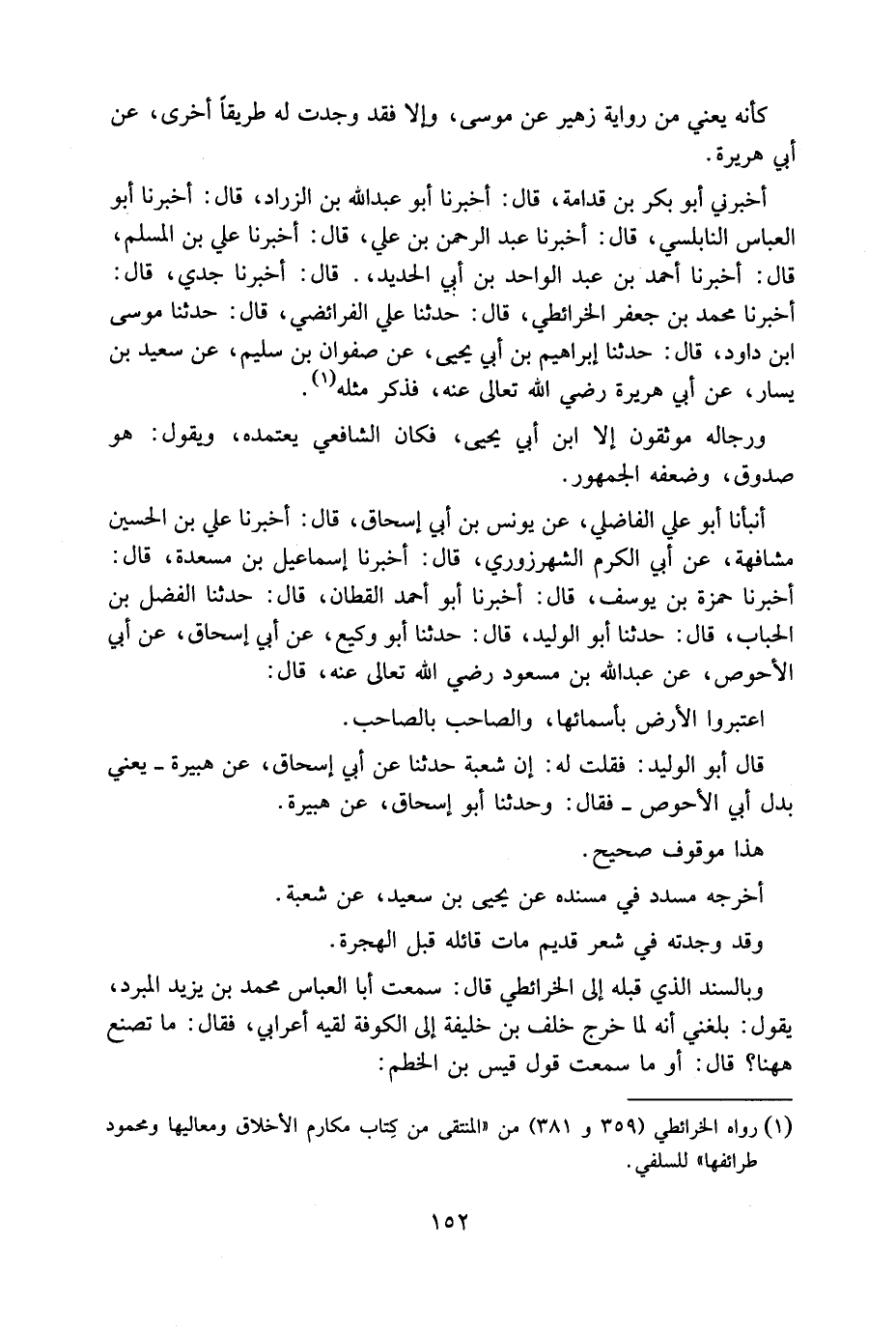 أَخْبَرَنِي أَبُو بَكْرِ بْنُ قُدَامَةَ قَالَ أَخْبَرَنَا أَبُو عَبْدِ اللَّهِ بْنِ الزَّرَّادِ قَالَ أَخْبَرَنَا أَبُو الْعَبَاسِ النَّابُلَسِيُّ قَالَ أَخْبَرَنَا عَبْدُ الرَّحْمَنِ بْنُ عَلِيٍّ قَالَ أَخْبَرَنَا عَلِيُّ بْنُ الْمُسْلِمِ قَالَ أَخْبَرَنَا أَحْمَدُ بْنُ عَبْدِ الْوَاحِدِ بْنُ أَبِي الْحَدِيدِ قَالَ أَخْبَرَنَا جَدِّي قَالَ أَخْبَرَنَا مُحَمَّدُ بْنُ جَعْفَرٍ الْخَرَائِطِيُّ قَالَ حَدَّثَنَا عَلِيٌّ الْفَرَائِضِي قَالَ حَدثنَا مُوسَى ابْن دَاوُدَ قَالَ حَدَّثَنَا إِبْرَاهِيمُ بْنُ أَبِي يَحْيَى عَنْ صَفْوَانَ بْنِ سَلِيمٍ عَنْ سَعِيدِ بْنِ يَسَارٍ عَنْ أَبِي هُرَيْرَةَ رَضِيَ اللَّهُ تَعَالَى عَنْهُ فَذَكَرَ مَثَلُهُ وَرِجَالُهُ مُوَثَّقُونَ إِلَّا ابْنُ أَبِي يَحْيَى فَكَانَ الشَّافِعِي يعتمده وَبقول هُوَ صَدُوقٌ وَضَعَّفَهُ الْجُمْهُورُ