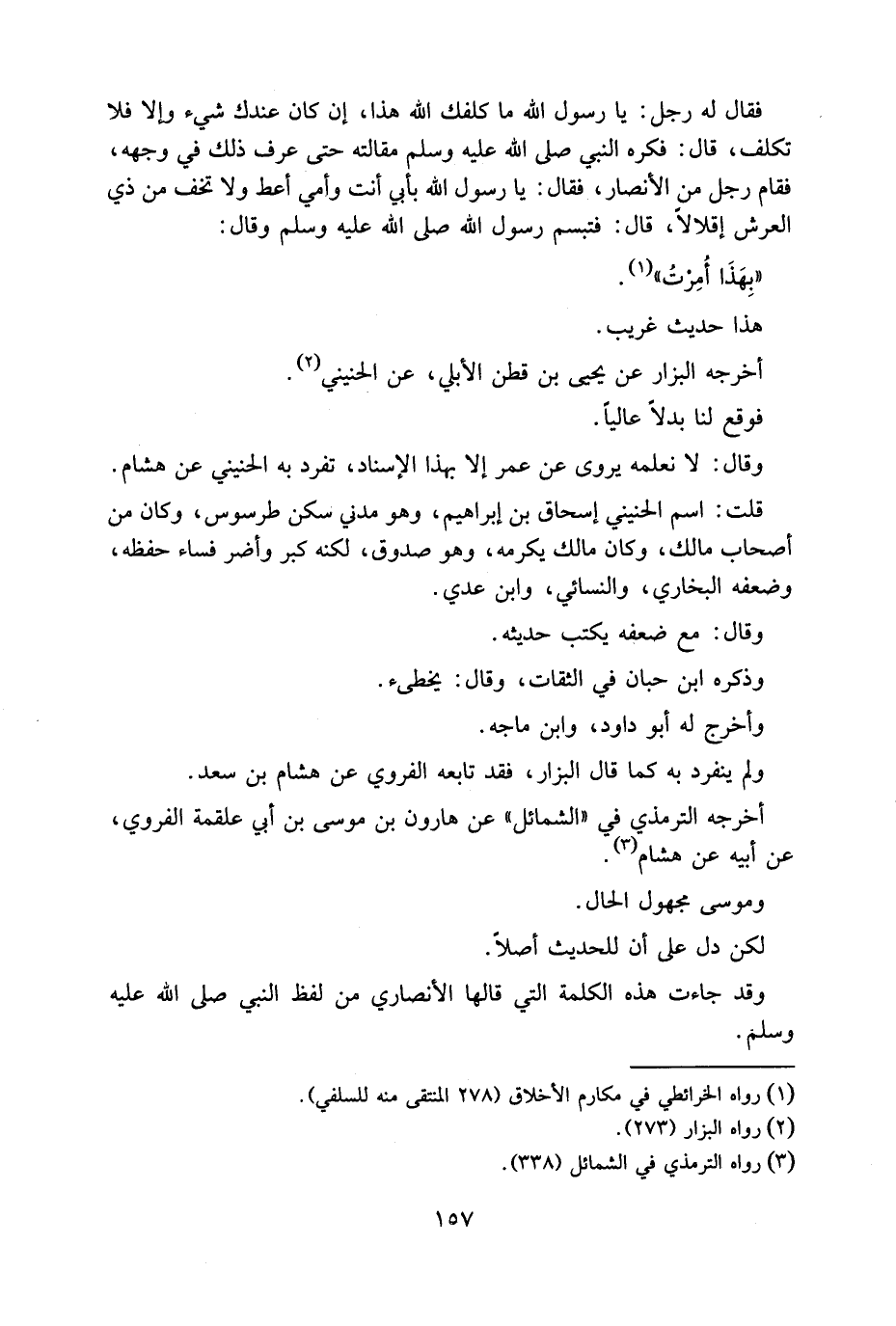 وَلَمْ يَنْفَرِدْ بِهِ كَمَا قَالَ الْبَزَّارُ فَقَدْ تَابَعَهُ الْفَرَوِيُّ عَنْ هِشَامِ بْنِ سَعْدٍ أَخْرَجَهُ التِّرْمِذِيُّ فِي الشَّمَائِلِ عَنْ هَارُونَ بْنِ مُوسَى بْنِ أَبِي عَلْقَمَةَ الْفَرَوِيِّ عَنْ أَبِيهِ عَنْ هِشَامٍ