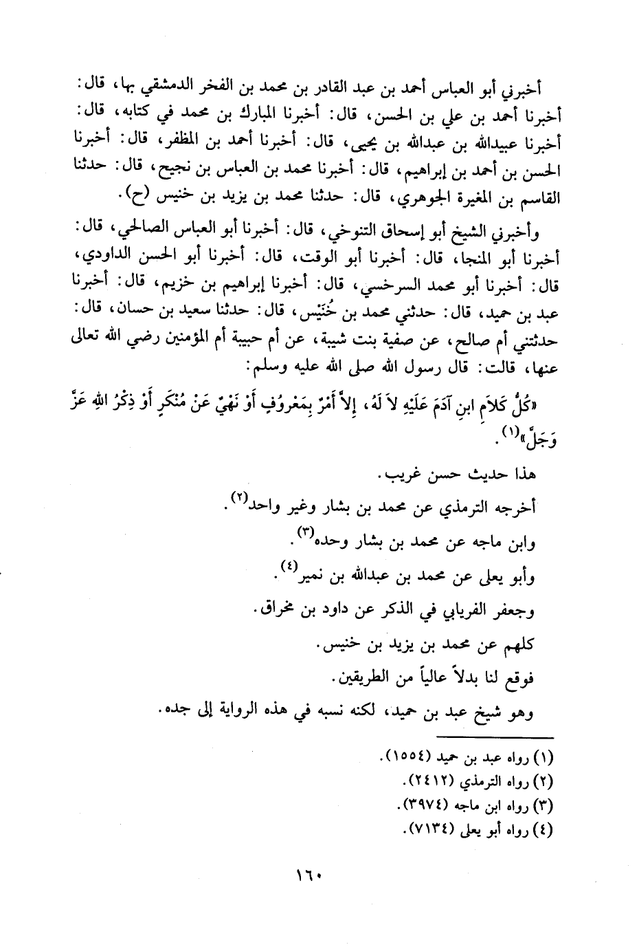 وَأَخْبَرَنِي الشَّيْخُ أَبُو إِسْحَاقَ التَّنُوخِيُّ قَالَ أَخْبَرَنَا أَبُو الْعَبَاسِ الصَّالِحِيُّ قَالَ أَخْبَرَنَا أَبُو الْمُنَجَّا قَالَ أَخْبَرَنَا أَبُو الْوَقْتِ قَالَ أَخْبَرَنَا أَبُو الْحَسَنِ الدَّاودِيُّ قَالَ أَخْبَرَنَا أَبُو مُحَمَّدٍ السَّرْخَسِيُّ قَالَ أَخْبَرَنَا إِبْرَاهِيمُ بْنُ خُزَيْمٍ قَالَ أَخْبَرَنَا عَبْدُ بْنُ حُمَيْدٍ قَالَ حَدَّثَنِي مُحَمَّدُ بْنُ خُنَيْسٍ قَالَ حَدَّثَنَا سَعِيدُ بْنُ حَسَّانَ قَالَ حَدَّثَتْنِي أُمُّ صَالِحٍ عَنْ صَفِيَّةَ بِنْتِ شَيْبَةَ عَنْ أُمِّ حَبِيبَةَ أُمِّ الْمُؤْمِنِينَ رَضِيَ اللَّهُ تَعَالَى عَنْهَا قَالَتْ قَالَ رَسُولُ اللَّهِ صَلَّى اللَّهُ عَلَيْهِ وَسَلَّمَ كُلُّ كَلَامِ ابْنِ آدَمَ عَلَيْهِ لَا لَهُ إِلَّا أَمْرٌ بِمَعْرُوفٍ أَوْ نَهْيٌ عَنْ مُنْكَرٍ أَوْ ذِكْرُ اللَّهِ عَزَّ وَجَلَّ
