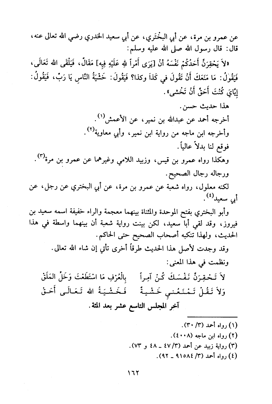 عْنَ عَمْرِو بْنِ مُرَّةَ عَنْ أَبِي الْبَخْتَرِيِّ عَنْ أَبِي سَعِيدٍ الْخُدَّرِيِّ رَضِيَ اللَّهُ تَعَالَى عَنْهُ قَالَ قَالَ رَسُولُ اللَّهِ صَلَّى اللَّهُ عَلَيْهِ وَسَلَّمَ لَا يُحْقِرنَّ أَحَدُكُمْ نَفْسَهُ أَنْ يَرَى أَمْرًا للَّهِ عَلَيْهِ فِيهِ مَقَالٌ فَيَلْقَى اللَّهَ تَعَالَى فَيَقُولُ مَا مَنَعَكَ أَنْ تَقُولَ فِي كَذَا وَكَذَا فَيَقُولَ خَشْيَةُ النَّاسِ يَا رَبِّ فَيَقُولُ إِيَّايَ كُنْتَ أَحَقَّ أَنْ تَخْشَى