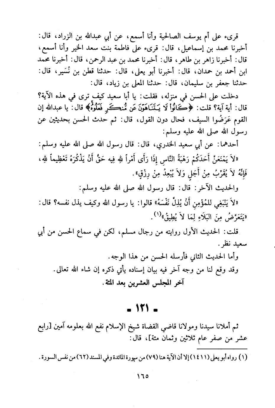قُرِئَ عَلَى أُمِّ يُوسُفَ الصَّالِحِيَّةِ وَأَنَا أَسْمَعُ عَنْ أَبِي عَبْدِ اللَّهِ بْنِ الزَّرَّادِ قَالَ أَخْبَرَنَا مُحَمَّدُ بْنُ إِسْمَاعِيلَ قَالَ قُرِئَ عَلَى فَاطِمَةَ بِنْتِ سَعْدِ الْخَيْرِ وَأَنَا أَسْمَعُ قَالَ أَخْبَرَنَا زَاهِرُ بْنُ طَاهِرٍ قَالَ أَخْبَرَنَا مُحَمَّدُ بْنُ عَبْدِ الرَّحْمَنِ قَالَ أَخْبَرَنَا مُحَمَّد ابْن أَحْمَدَ بْنِ حَمْدَانَ قَالَ أَخْبَرَنَا أَبُو يَعْلَى قَالَ حَدَّثَنَا قُطْنُ بْنُ نُسَيْرٍ قَالَ حَدَّثَنَا جَعْفَرُ بْنُ سُلَيْمَانَ قَالَ حَدَّثَنَا الْمُعَلَى بْنُ زِيَادٍ قَالَ دَخَلْتُ عَلَى الْحَسَنِ فِي مَنْزِلِهِ فَقُلْتُ يَا أَبَا سَعِيدٍ كَيْفَ تَرَى فِي هَذِهِ الْآيَةِ قَالَ أَيَّةُ آيَةٍ قُلْتُ {كَانُوا لَا يَتَنَاهَوْنَ عَنْ مُنكر فَعَلُوهُ} قَالَ يَا عَبْدَ اللَّهِ إِنَّ الْقَوْمَ عَرَضُوا السَّيْفَ فَحَالَ دُونَ الْقَوْلِ قَالَ ثُمَّ حَدَّثَ الْحَسَنُ بِحَدِيثَيْنِ عَنْ رَسُولِ اللَّهِ صَلَّى اللَّهُ عَلَيْهِ وَسَلَّمَ
