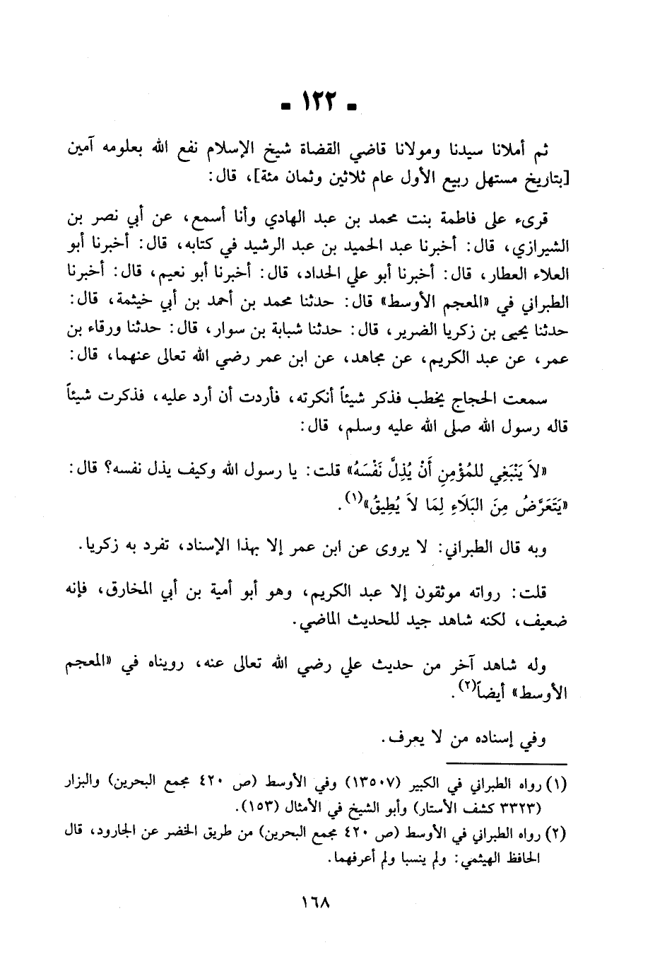 122 - ثمَّ أملانا سيدنَا ومولانا قَاضِي الْقُضَاة شيخ الْإِسْلَام نفع الله بِعُلُومِهِ آمين بتاريخ مستهل ربيع الأول عَام ثَلَاثِينَ وثمان مئة قَالَ قُرِئَ عَلَى فَاطِمَةَ بِنْتِ مُحَمَّدِ بْنِ عَبْدِ الْهَادِي وَأَنَا أَسْمَعُ عَنْ أَبِي نَصْرِ بْنِ الشِّيرَازِيِّ قَالَ أَخْبَرَنَا عَبْدُ الْحَمِيدِ بْنُ عَبْدِ الرَّشِيدِ فِي كِتَابِهِ قَالَ أَخْبَرَنَا أَبُو الْعَلَاءِ الْعَطَّارُ قَالَ أَخْبَرَنَا أَبُو عَلِيٍّ الْحَدَّادُ قَالَ أَخْبَرَنَا أَبُو نُعَيْمٍ قَالَ أَخْبَرَنَا الطَّبَرَانِيُّ فِي الْمُعْجَمِ الْأَوْسَطِ قَالَ حَدَّثَنَا مُحَمَّدُ بْنُ أَحْمَدَ بْنِ أَبِي خَيْثَمَةَ قَالَ حَدَّثَنَا يَحْيَى بْنُ زَكَرِيَّا الضَّرِيرُ قَالَ حَدَّثَنَا شُبَابَةُ بْنُ سَوَّارٍ قَالَ حَدَّثَنَا وَرْقَاءُ بْنُ عُمَرَ عَنْ عَبْدِ الْكَرِيمِ عَنْ مُجَاهِدٍ عَنِ ابْنِ عُمَرَ رَضِيَ اللَّهُ تَعَالَى عَنْهُمَا قَالَ