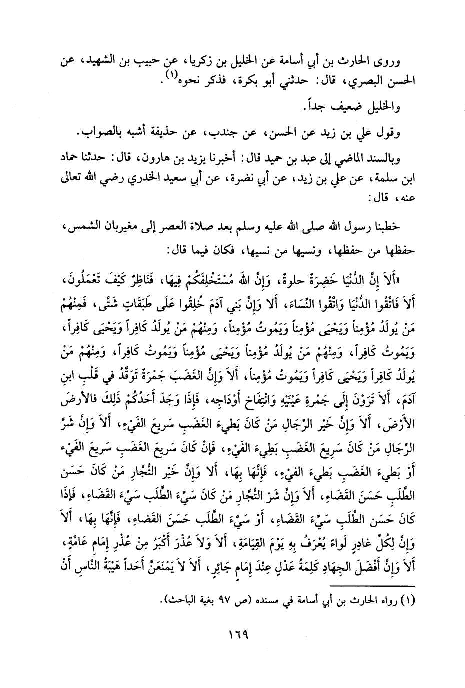 وَرَوَى الْحَارِثُ بْنُ أَبِي أُسَامَةَ عَنِ الْخَلِيلِ بْنِ زَكَرِيَّا عَنْ حَبِيبِ بْنِ الشَّهِيدِ عَنِ الْحَسَنِ الْبَصْرِيِّ قَالَ حَدَّثَنِي أَبُو بَكْرَةَ فَذكر نَحوه والخليل ضَعِيف جدا