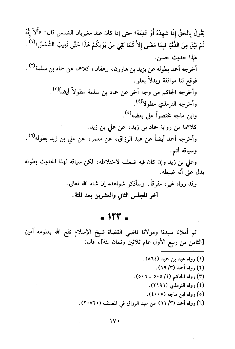 123 - ثمَّ أملانا سيدنَا ومولانا قَاضِي الْقُضَاة شيخ الْإِسْلَام نفع الله بِعُلُومِهِ آمين الثَّامِن من ربيع الأول عَام ثَلَاثِينَ وثمان مئة قَالَ