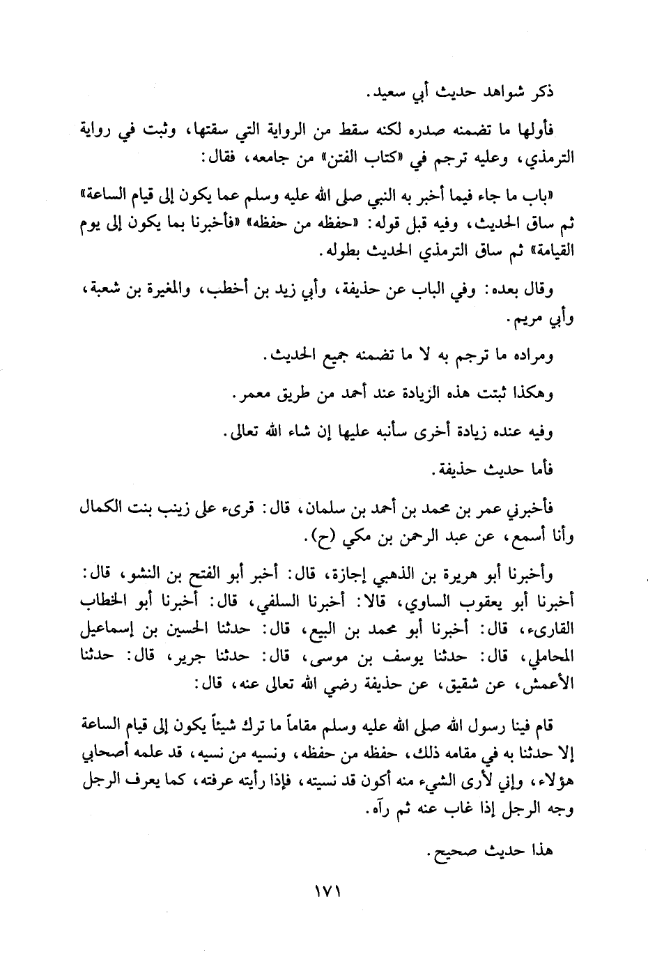 قَالَ قَامَ فِينَا رَسُولُ اللَّهِ صَلَّى اللَّهُ عَلَيْهِ وَسَلَّمَ مَقَامًا مَا تَرَكَ شَيْئًا يَكُونُ إِلَى قِيَامِ السَّاعَةِ إِلَّا حَدَّثَنَا بِهِ فِي مَقَامِهِ ذَلِكَ حَفِظَهُ مَنْ حَفِظَهُ وَنَسِيَهُ مَنْ نَسِيَهُ قَدْ عَلِمَهُ أَصْحَابِي هَؤُلَاءِ وَإِنِّي لَأَرَى الشَّيْءَ مِنْهُ أَكُونُ قَدْ نَسِيتُهُ فَإِذَا رَأَيْتُهُ عَرَفْتُهُ كَمَا يَعْرِفُ الرَّجُلُ وَجْهَ الرَّجُلِ إِذَا غَابَ عَنْهُ ثُمَّ رَآهُ هَذَا حَدِيث صَحِيح