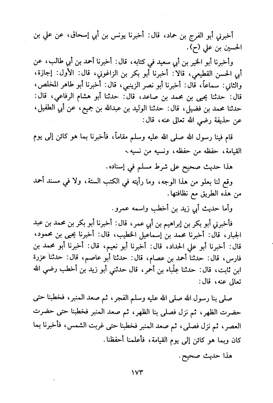 فَأَخْبَرَنِي أَبُو بَكْرِ بْنُ إِبْرَاهِيمَ بْنِ أَبِي عُمَرَ قَالَ أَخْبَرَنَا أَبُو بَكْرِ بْنُ مُحَمَّدِ بْنِ عَبْدِ الْجَبَّارِ قَالَ أَخْبَرَنَا مُحَمَّدُ بْنُ إِسْمَاعِيلَ الْخَطِيبُ قَالَ أَخْبَرَنَا يَحْيَى بْنُ مَحْمُودٍ قَالَ أَخْبَرَنَا أَبُو عَلِيٍّ الْحَدَّادُ قَالَ أَخْبَرَنَا أَبُو نُعَيْمٍ قَالَ أَخْبَرَنَا أَبُو مُحَمَّدِ بْنُ فَارِسٍ قَالَ حَدَّثَنَا أَحْمَدُ بْنُ عِصَامٍ قَالَ حَدَّثَنَا أَبُو عَاصِمٍ قَالَ حَدَّثَنَا عُزْرَةُ ابْن ثَابِتٍ قَالَ حَدَّثَنَا عِلْبَاءُ بْنُ أَحْمَرَ قَالَ حَدَّثَنِي أَبُو زَيْدِ بْنُ أَخْطَبَ رَضِيَ اللَّهُ تَعَالَى عَنهُ قَالَ