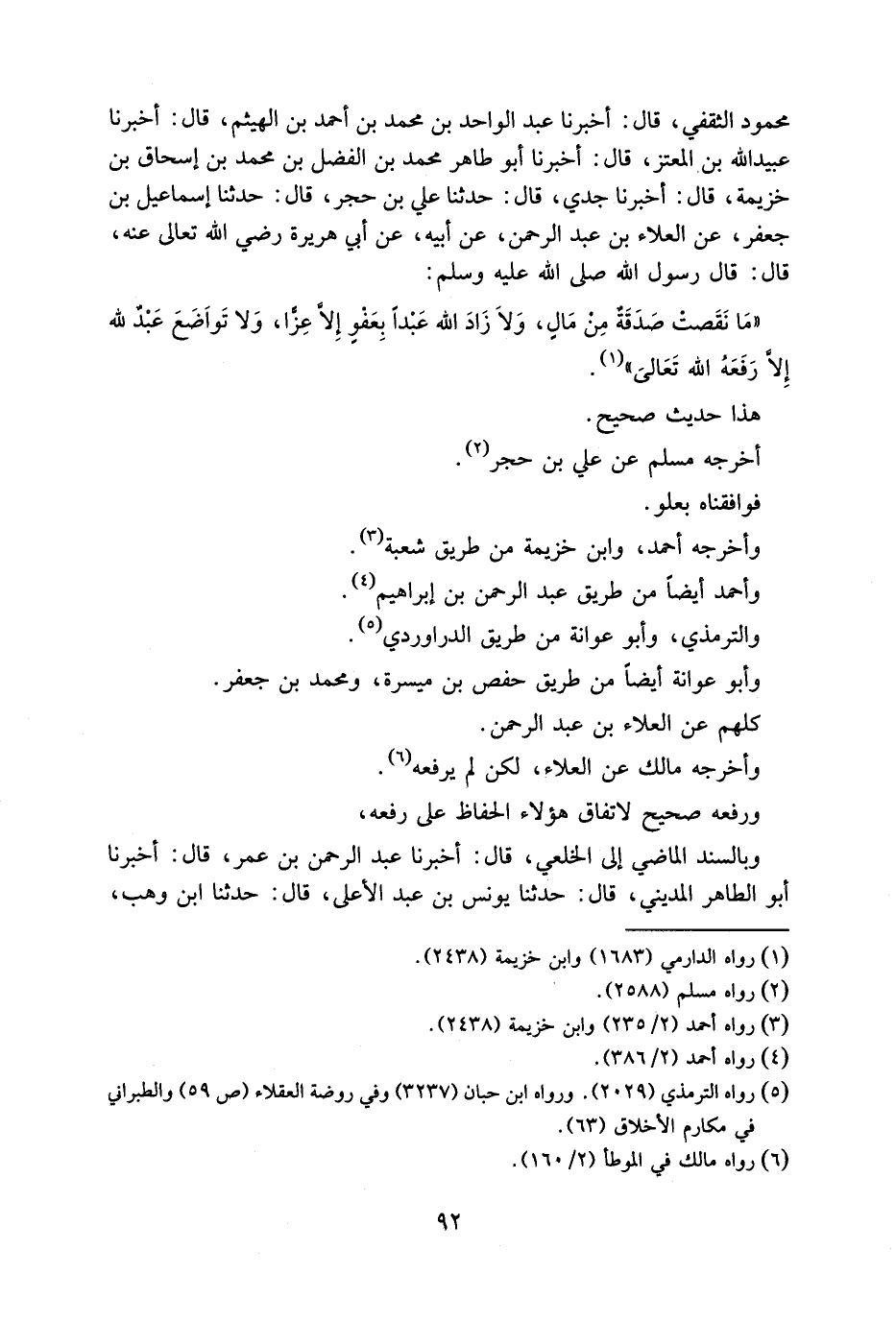 أَخْبَرَنَا عُبَيْدُ اللَّهِ بْنُ الْمُعْتَزِ قَالَ أَخْبَرَنَا أَبُو طَاهِرٍ مُحَمَّدُ بْنُ الْفَضْلِ بْنِ مُحَمَّدِ بْنِ إِسْحَاقَ بْنِ خُزَيْمَةَ قَالَ أَخْبَرَنَا جَدِّي قَالَ حَدَّثَنَا عَلِيُّ بْنُ حَجَرٍ قَالَ حَدَّثَنَا إِسْمَاعِيلُ بْنُ جَعْفَرٍ عَنِ الْعَلَاءِ بْنِ عَبْدِ الرَّحْمَنِ عَنْ أَبِيهِ عَنْ أَبِي هُرَيْرَةَ رَضِيَ اللَّهُ تَعَالَى عَنْهُ قَالَ قَالَ رَسُولُ اللَّهِ صَلَّى اللَّهُ عَلَيْهِ وَسَلَّمَ مَا نَقَصَتْ صَدَقَةٌ مِنْ مَالٍ وَلَا زَادَ اللَّهُ عَبْدًا بِعَفْوٍ إِلَّا عِزَّا وَلَا تَواضَعَ عَبْدٌ لِلَّهِ إِلَّا رَفَعَهُ اللَّهُ تَعَالى