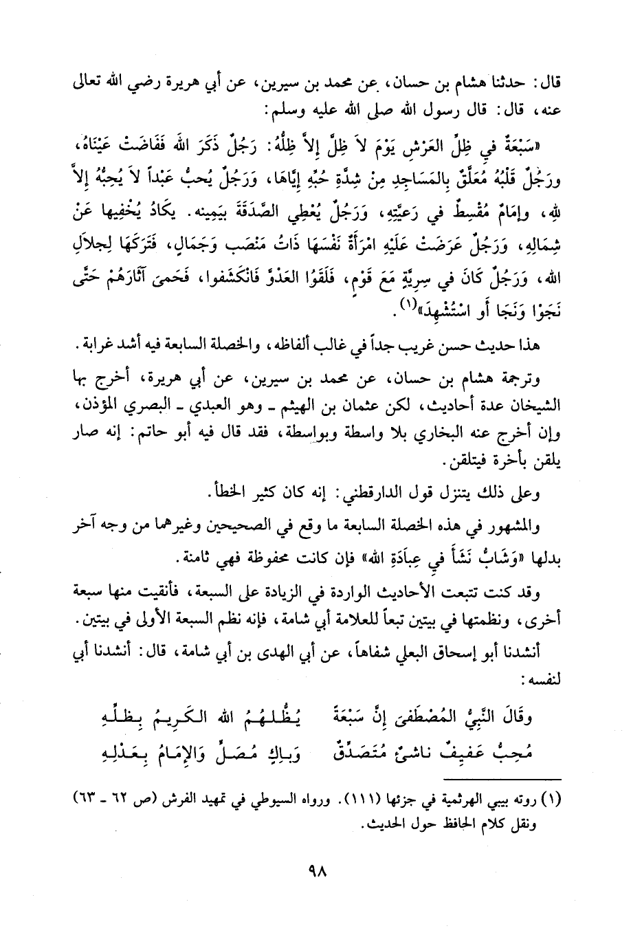 قَالَ حَدَّثَنَا هِشَامُ بْنُ حَسَّانَ عَنْ مُحَمَّدِ بْنِ سِيرِينَ عَنْ أَبِي هُرَيْرَةَ رَضِيَ اللَّهُ تَعَالَى عَنْهُ قَالَ قَالَ رَسُولُ اللَّهِ صَلَّى اللَّهُ عَلَيْهِ وَسَلَّمَ سَبْعَةٌ فيِ ظِلِّ الْعَرْشِ يَوْمَ لَا ظِلَّ إِلَّا ظِلُّهُ رَجُلٌ ذَكَرَ اللَّهَ فَفَاضَتْ عَيْنَاهُ وَرَجُلٌ قَلْبُهُ مُعَلَّقٌ بِالْمَسَاجِدِ مِنْ شِدَّةِ حُبِّهِ إِيَّاهَا وَرَجُلٌ يُحبُّ عَبْدًا لَا يُحِبُّهُ إِلَّا لِلَّهِ وَإِمَامٌ مُقْسِطٌ فِي رَعيته وَرجل يُعْطي يُغطي الصَّدَقَةَ بيَمِينِهِ يَكَادُ يُخْفِيهَا عَنْ شِمَاله وَرجل عرضت عَلَيْهِ امْرَأَة نَفسهَا ذَات منصب وجمال فَتَركهَا لجلال الله وَرَجُلٌ كَانَ فِي سَرِيَّةٍ مَعَ قَوْمٍ فَلَقُوا الْعَدُوَّ فَانْكَشَفُوا فَحَمَى آثَارَهُمْ حَتَّى نَجَوْا وَنَجَا أَوِ اسْتشْهد