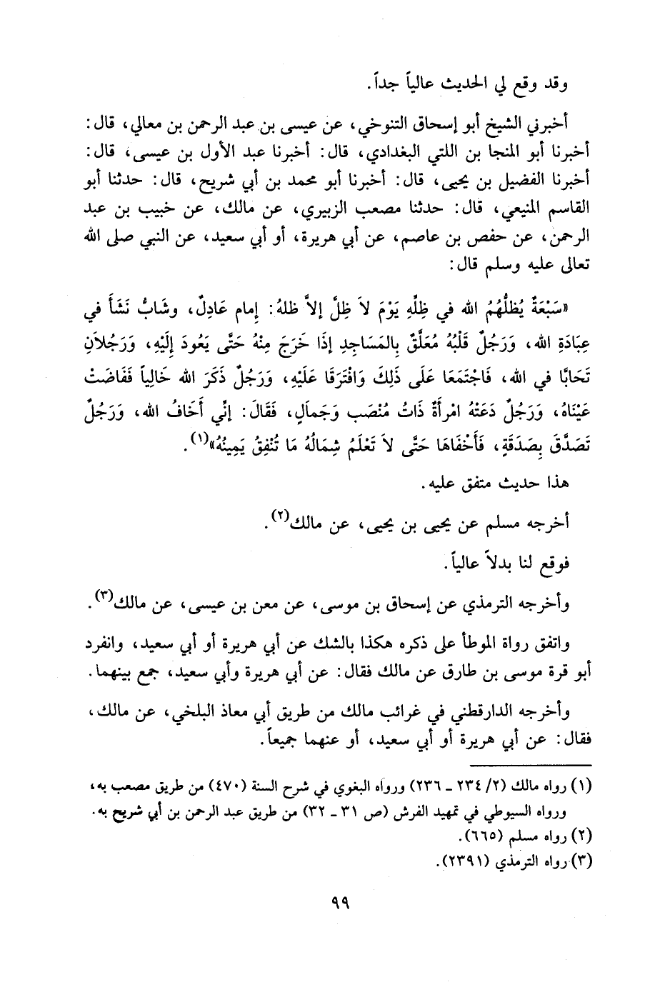 وَقَدْ وَقَعَ لِيَ الْحَدِيثِ عَالِيًا جِدًّا أَخْبَرَنِي الشَّيْخُ أَبُو إِسْحَاقَ التَّنُوخِيُّ عَنْ عِيسَى بْنِ عَبْدِ الرَّحْمَنِ بْنِ مَعَالِي قَالَ أَخْبَرَنَا أَبُو الْمُنَجَّا بْنُ اللَّتِي الْبُغْدَادِيُّ قَالَ أَخْبَرَنَا عَبْدُ الْأَوَّلِ بْنُ عِيسَى قَالَ أَخْبَرَنَا الْفَضِيلُ بْنُ يَحْيَى قَالَ أَخْبَرَنَا أَبُو مُحَمَّدِ بْنُ أَبِي شُرَيْحٍ قَالَ حَدَّثَنَا أَبُو الْقَاسِمِ الْمُنَيْعِيُّ قَالَ حَدَّثَنَا مُصْعَبُ الزُّبَيْرِيُّ عَنْ مَالِكٍ عَنْ خُبَيْبِ بْنِ عَبْدِ الرَّحْمَنِ عَنْ حَفْصِ بْنِ عَاصِمٍ عَنْ أَبِي هُرَيْرَةَ أَوْ أَبِي سَعِيدٍ عَنِ النَّبِي صلى الله تَعَالَى عَلَيْهِ وَسَلَّمَ قَالَ سَبْعَةٌ يُظلُّهُمُ اللَّهُ فِي ظِلِّهِ يَوْمَ لَا ظِلَّ إلَّا ظِلُّهُ إِمَامٌ عَادِلٌ وَشَابٌّ نَشَأَ فِي عِبَادَةِ اللَّهِ وَرَجُلٌ قَلْبُهُ مُعَلَّقٌ بِالْمَسَاجِدِ إِذَا خَرَجَ مِنْهُ حَتَّى يَعُودَ إِلَيْهِ وَرَجُلَانِ تَحَابَّا فِي اللَّهِ فَاجْتَمَعَا على ذَلِك وافترقا عَلَيْهِ وَرجل ذَكَرَ اللَّهَ خَالِيًا فَفَاضَتْ عَيْنَاهُ وَرَجُلٌ دَعَتْهُ امْرَأَةٌ ذَاتُ مُنْصَبٍ وَجَمَالٍ فَقَالَ إنِّي أَخَافُ اللَّهَ وَرَجُلٌ تَصَدَّقَ بِصَدَقَةٍ فَأَخْفَاهَا حَتَّى لَا تَعْلَمُ شِمَالُهُ مَا تُنْفِقُ يَمِينه
