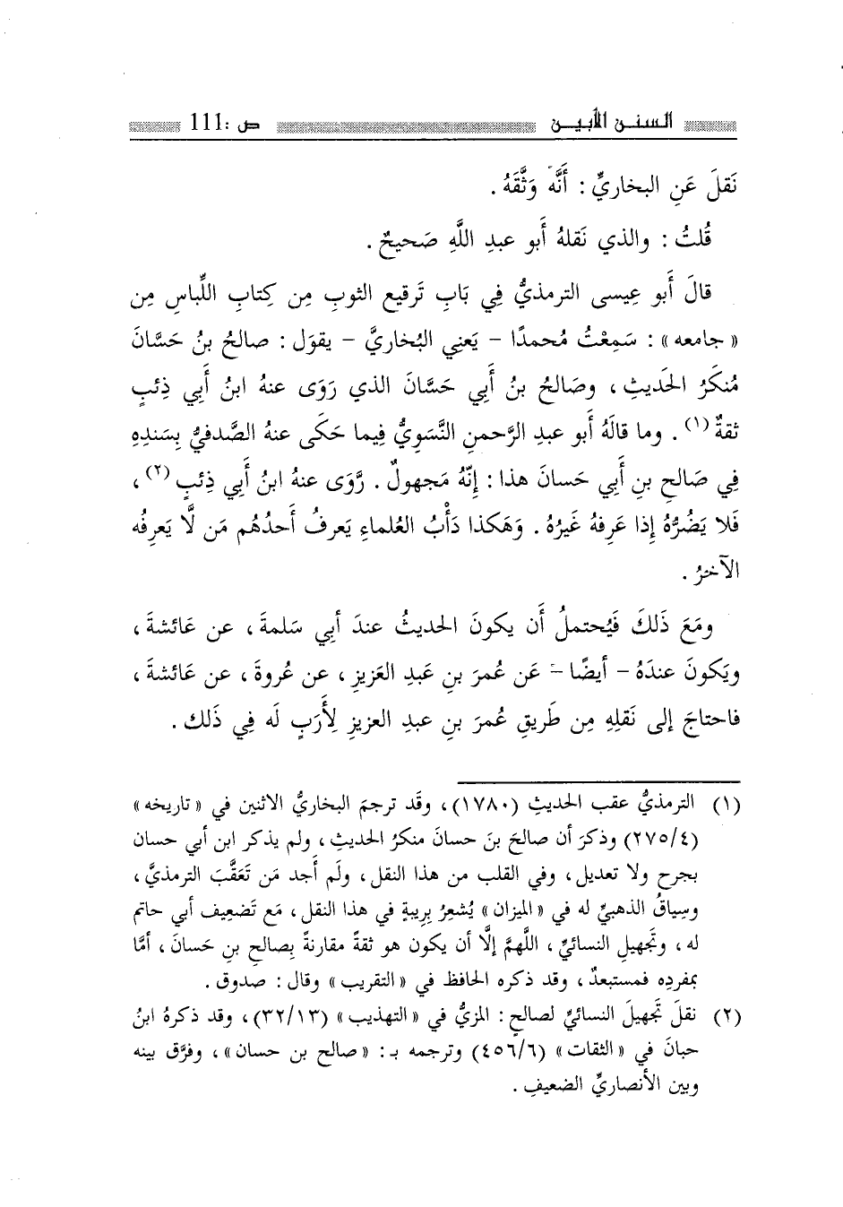 // ثِقَة وَمَا قَالَه أَبُو عبد الرَّحْمَن النسوي فِيمَا حكى عَنهُ الصَّدَفِي بِسَنَدِهِ فِي صَالح بن أبي حسان هَذَا إِنَّه مَجْهُول روى عَنهُ ابْن أبي ذِئْب فَلَا يضرّهُ إِذا عرفه غَيره وَهَكَذَا دأب الْعلمَاء يعرف أحدهم من لَا يعرفهُ الآخر