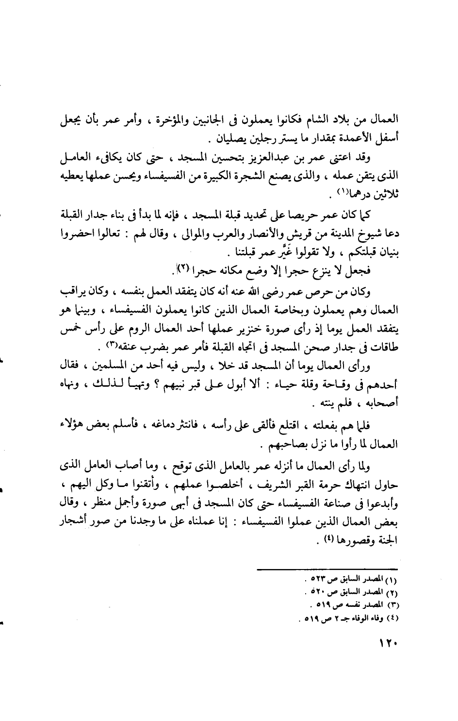 ... ولما رأى العمال ما أنزله عمر بالعامل الذى توقح، وما أصاب العامل الذى حاول انتهاك حرمة القبر الشريف، أخلصوا عملهم، وأتقنوا ما وكل اليهم، وأبدعوا في صناعة الفسيفساء حتى كان المسجد في أبهى صورة وأجمل منظر، وقال بعض العمال الذين عملوا الفسيفساء: إنا عملناه على ما وجدنا من صور أشجار الجنة وقصورها (4).