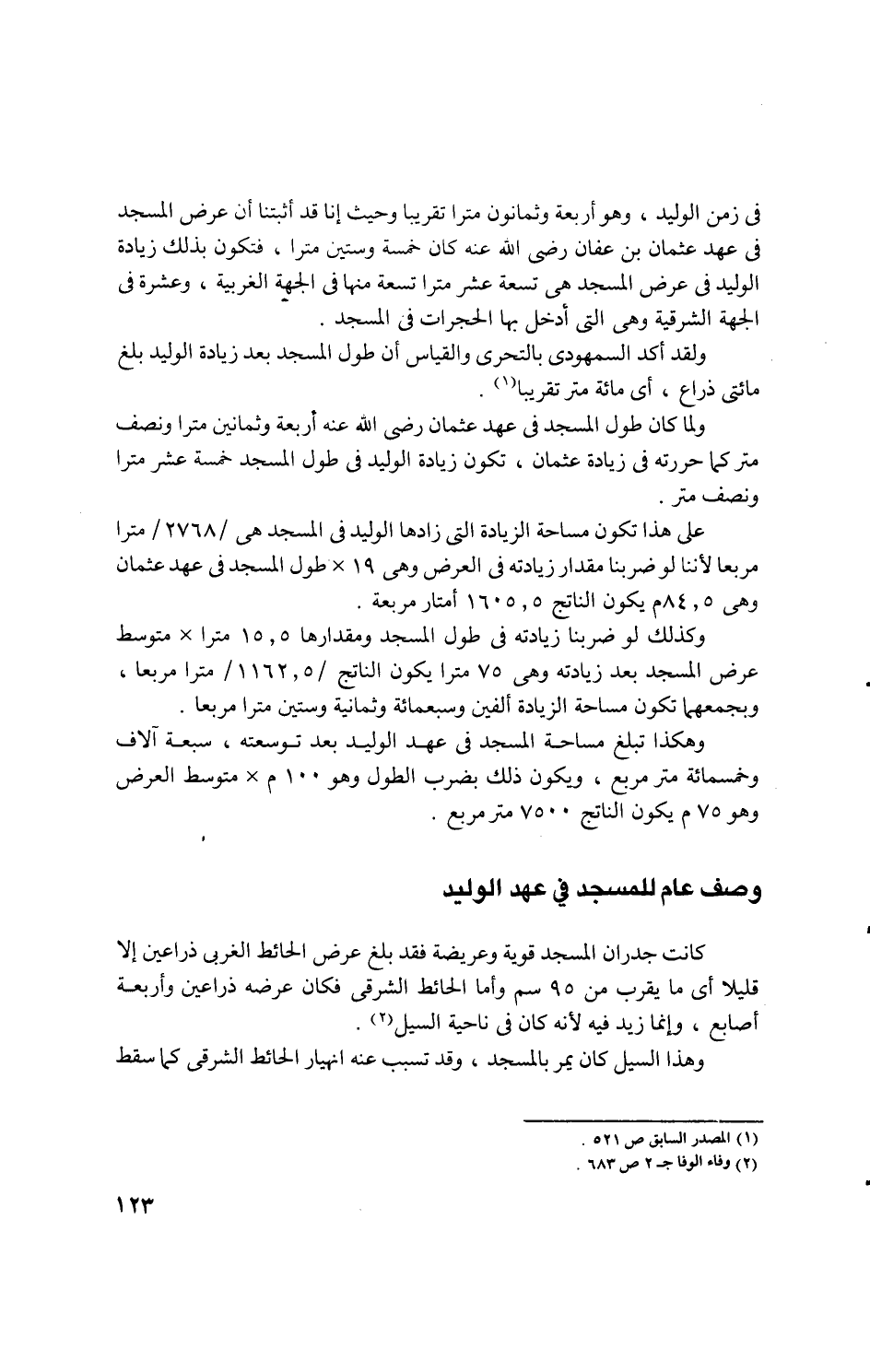 ... ولقد أكد السمهودى بالتحرى والقياس أن طول المسجد بعد زيادة الوليد بلغ مائتى ذراع، أى مائة متر تقريبا (1).