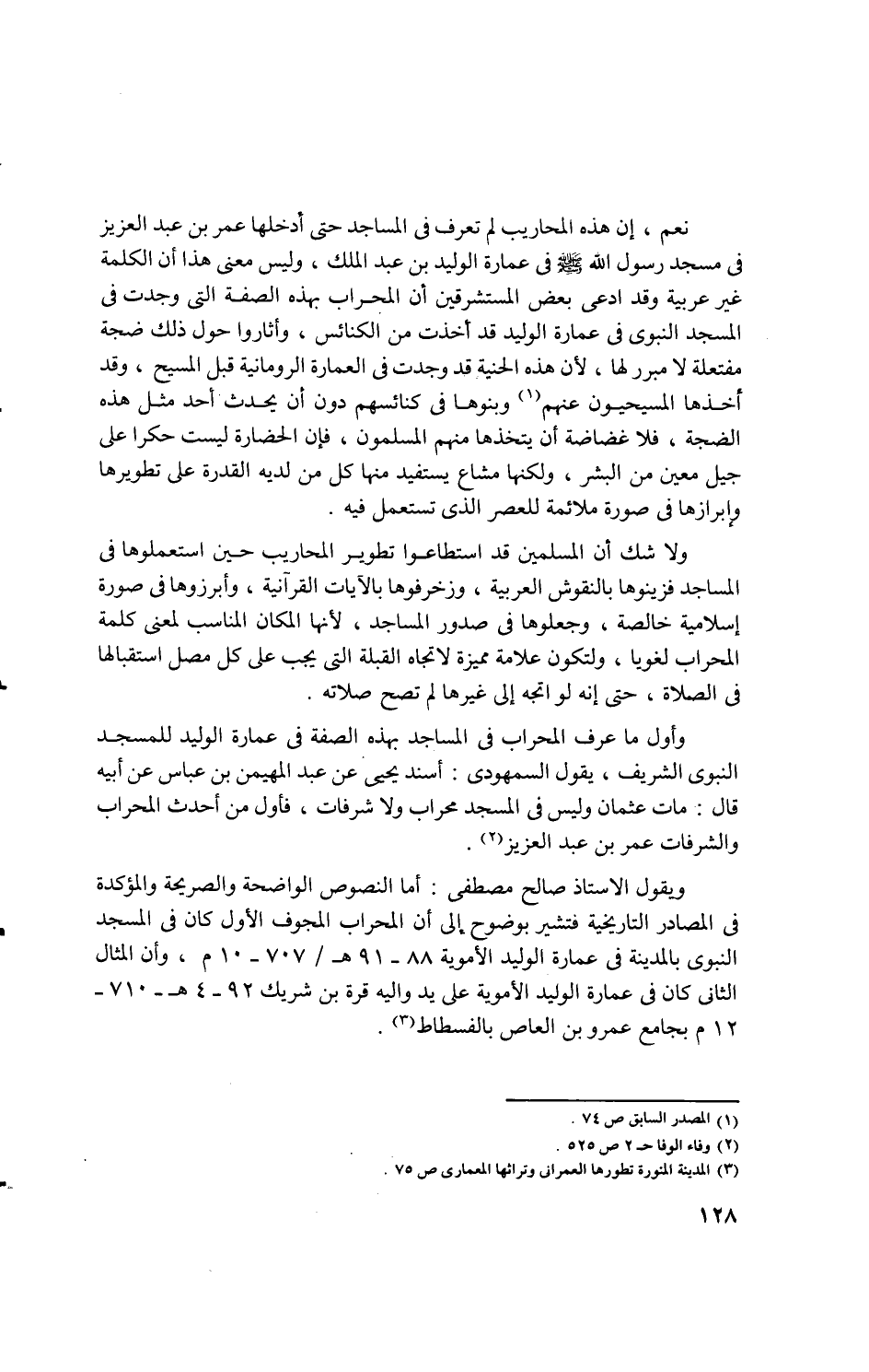 ... ويقول الاستاذ صالح مصطفى: أما النصوص الواضحة والصريحة والمؤكدة في المصادر التاريخية فتشير بوضوح إلى أن المحراب المجوف الأول كان في المسجد النبوى بالمدينة في عمارة الوليد الأموية 88 - 91هـ/ 707 - 10م، وأن المثال الثاني كان في عمارة الوليد الأموية على يد قرة بن شريك 92 - 4هـ - 710 - 12 م بجامع عمرو بن العاص بالفسطاط (3).