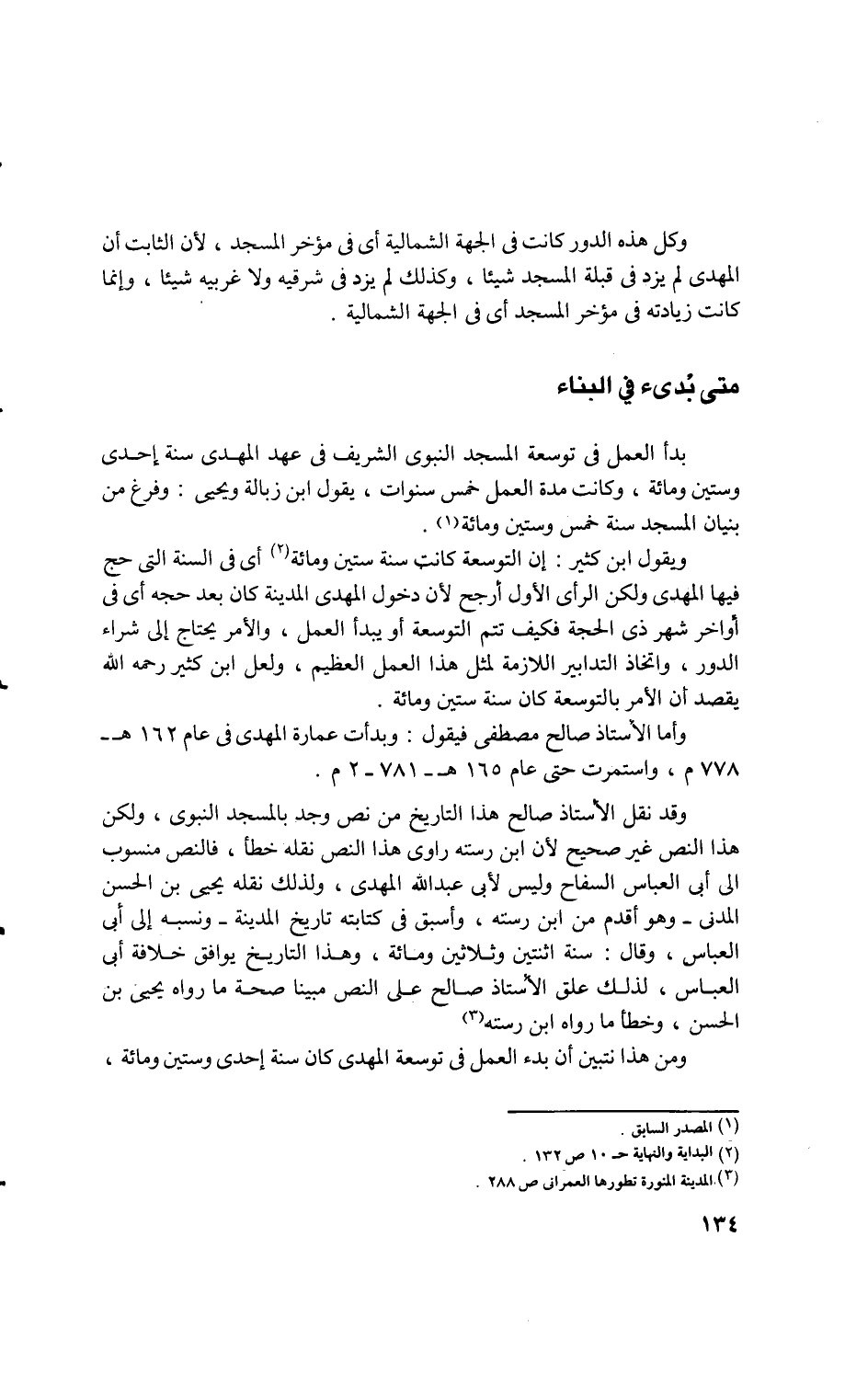 ... وأما الأستاذ صالح مصطفى فيقول: وبدأت عمارة المهدى في عام 162 هـ، 778 م، واستمرت حتى عام 165هـ- 781 - 2م.