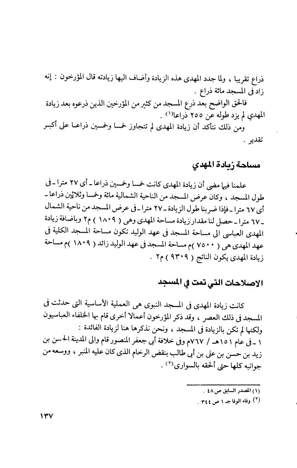 ... علمنا فيما مضى أن زيادة المهدى كانت خمسة وخمسين ذراعا -أى 27 مترا- في طول المسجد، وكان عرض المسجد من الناحية الشمالية مائة وخمسا وثلاثين ذراعا - أى 67 مترا - فإذا ضربنا طول الزيادة -27 مترا - في عرض المسجد من ناحية الشمال -67 مترا - حصل لنا مقدار زيادة مساحة المهدى وهى (1809) م2 وباضافة زيادة المهدى العباسى الى مساحة المسجد في عهد الوليد تكون مساحة المسجد الكلية في عهد المهدى هى (7500) م مساحة المسجد في عهد الوليد زائد (1809) م مساحة زيادة المهدى يكون الناتج (9309) م2.