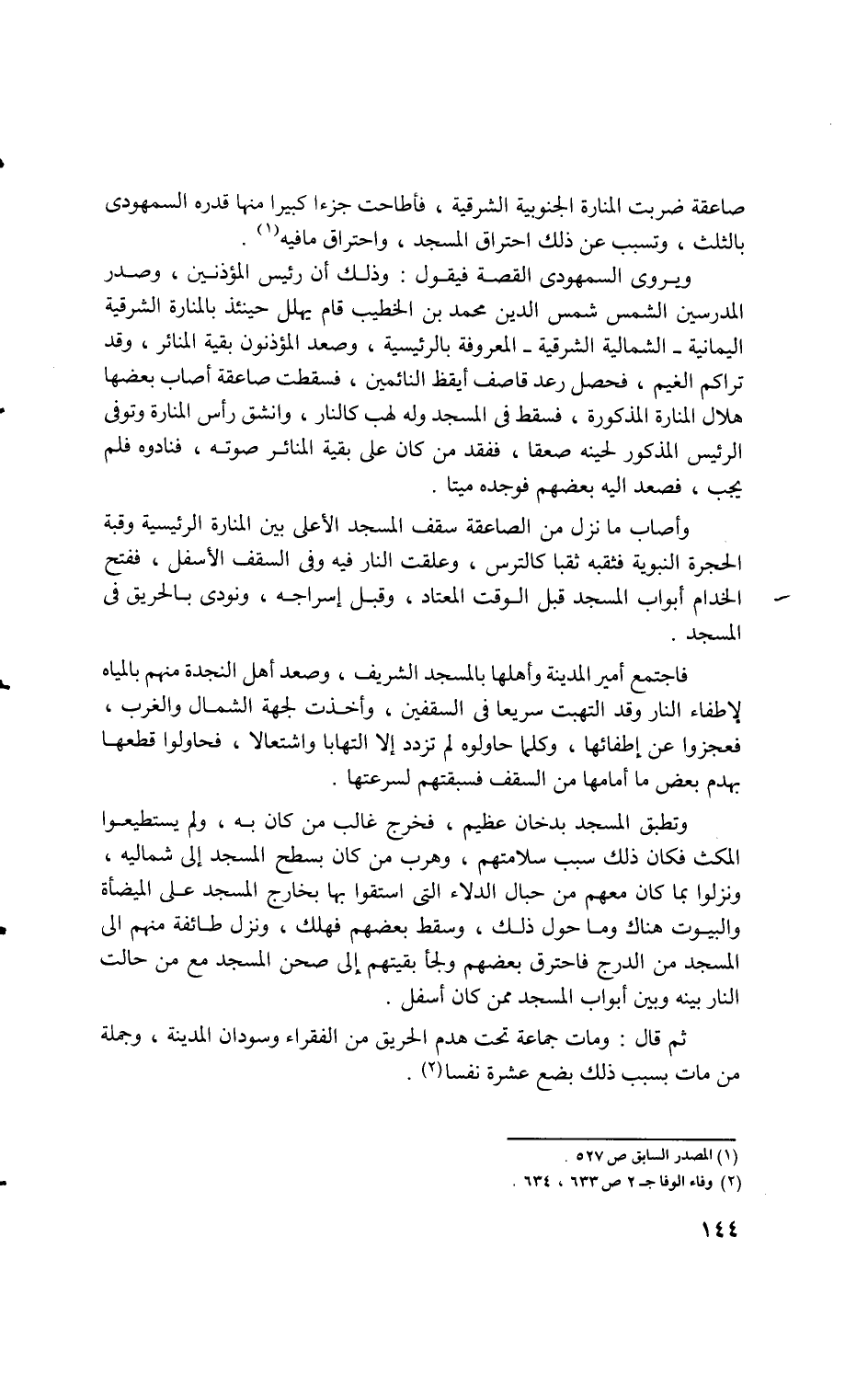 ... ثم قال: ومات جماعة تحت هدم الحريق من الفقراء وسودان المدينة، وجملة من مات بسبب ذلك بضع عشرة نفسا (1).