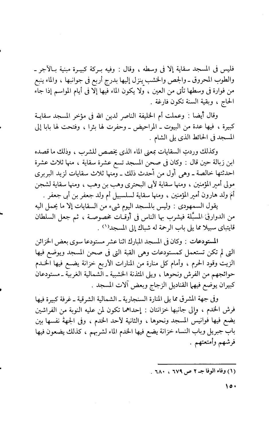... وكذلك وردت السقايات بمعنى الماء الذى يخصص للشرب، وذلك ما قصده ابن زبالة حين قال: وكان في صحن المسجد تسع عشرة سقاية، ومنها ثلاث عشرة احدثتها خالصة _ وهى أول من أحدث ذلك _ومنها ثلاث سقايات لزيد البربرى مولى أمير المؤمنين، ومنها سقاية لأبى البحترى وهب بن وهب، ومنها سقاية لشجن أم ولد هارون أمير المؤمنين، ومنها سقاية لشجن أم ولد هارون أمير المؤمنين، ومنها سقاية لسلسبيل أم ولد جعفر بن أبى جعفر.