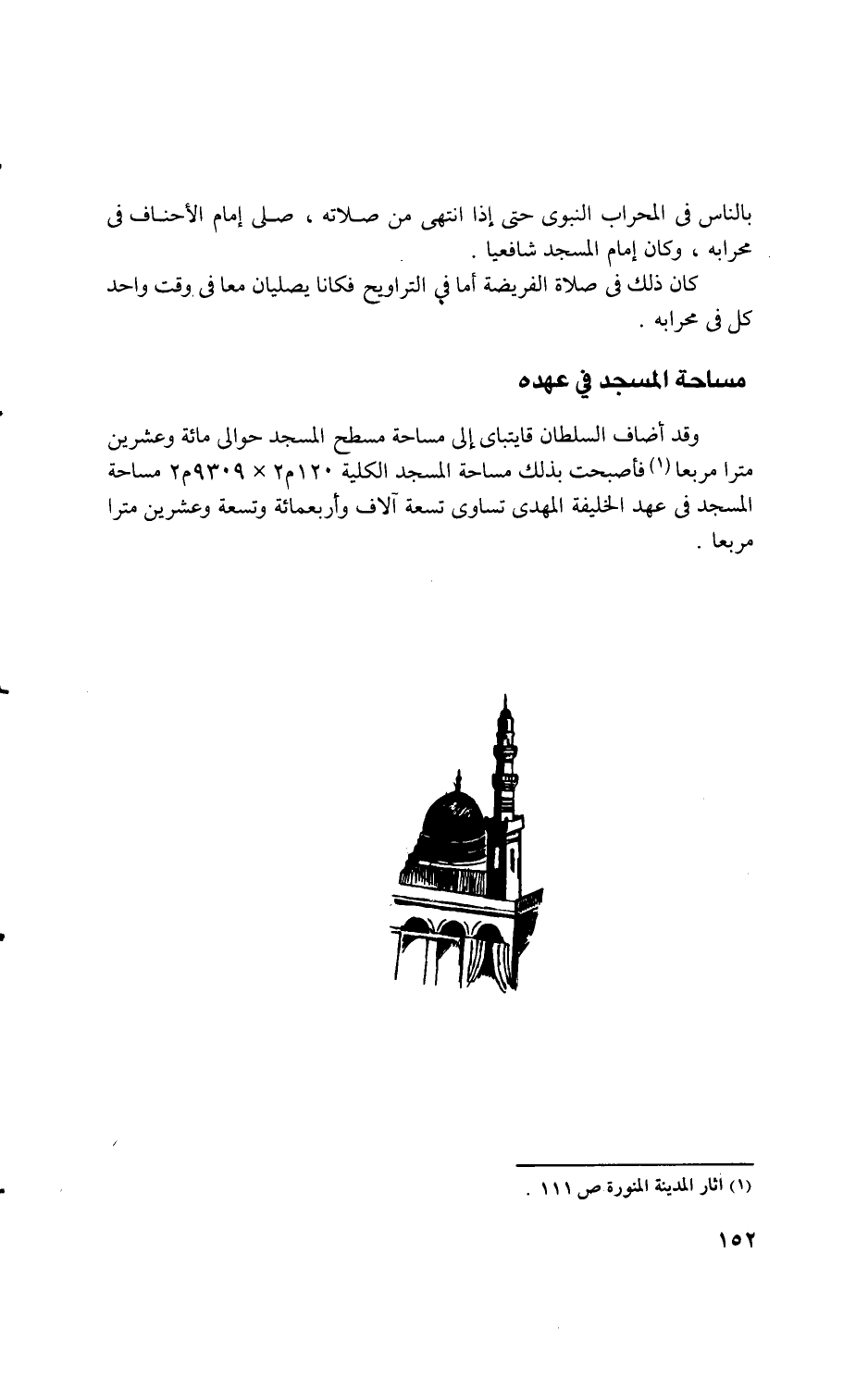 ... وقد أضاف السلطان قايتباى إلى مساحة مسطح المسجد حوالى مائة وعشرين مترا مربعا (1) فأصبحت بذلك مساحة المسجد الكلية 120م2 × 9309م2 مساحة المسجد في عهد الخليفة المهدى تسعة آلاف وأربعمائة وتسعة وعشرين مترا مربعا.