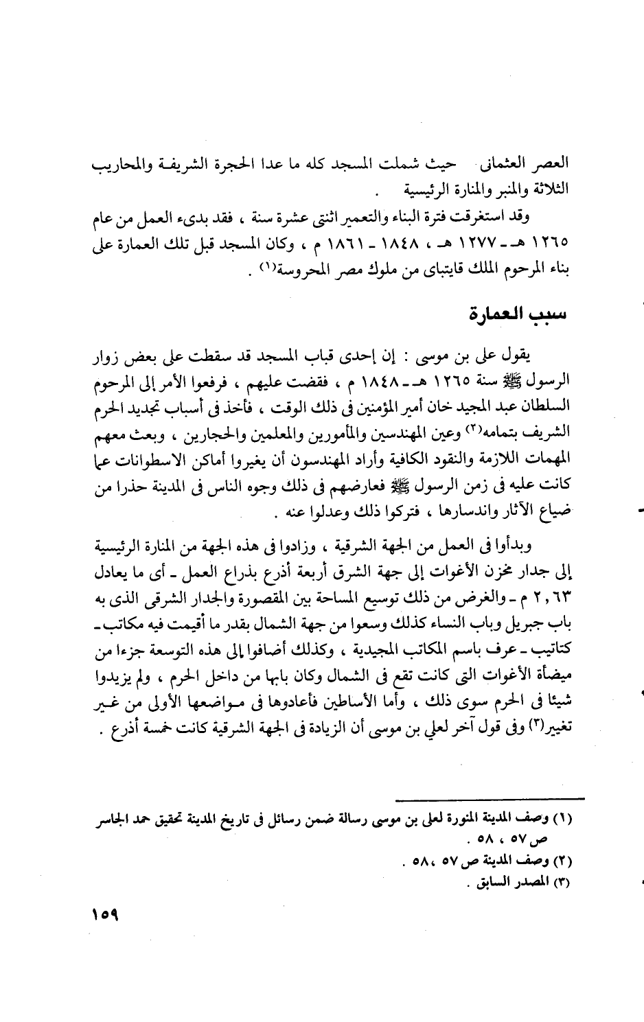... يقول على بن موسى: إن إحدى قباب المسجد قد سقطت على بعض زوار الرسول - صلى الله عليه وسلم - سنة 1265 هـ - 1848 م، فقضت عليهم، فرفعوا الأمر إلى المرحوم السلطان عبد المجيد خان أمير المؤمنين في ذلك الوقت، فأخذ في أسباب تجديد الحرم الشريف بتمامه (2) وعين المهندسين والمأمورين والمعلمين والحجارين، وبعث معهم المهمات اللازمة والنقود الكافية وأراد المهندسون أن يغيروا أماكن الاسطوانات عما كانت عليه زمن الرسول - صلى الله عليه وسلم - فعارضهم في ذلك وجوه الناس في المدينة حذرا من ضياع الآثار واندسارها، فتركوا ذلك وعدلوا عنه.