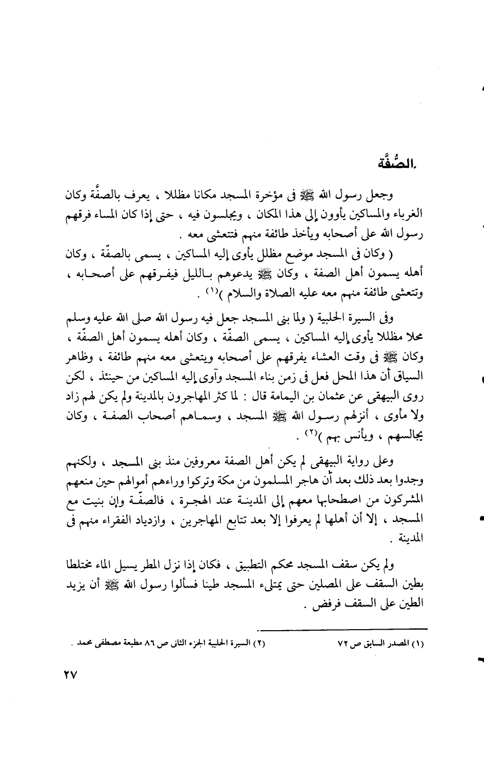 وفى السيرة الحلبية 0ولما بنى المسجد جعل فيه رسول الله - صلى الله عليه وسلم - محلا مظللا يأوى إليه المساكين، يسمى الصفَّة، وكان أهله يسمون اهل الصفَّة، وكان صلى الله عليه وسلم في وقت العشاء يفرقهم على أصحابه ويتعشى معه منهم طائفة، وظاهر السياق أن هذا المحل فعل في زمن بناء المسجد وآوى إليه المساكين من حينئذ، لكن روى البيهقي عن عثمان بن اليمامة قال: لما كثر المهاجرون بالمدينة ولم يكن لهم زاد ولا مأوى، أنزلهم رسول الله - صلى الله عليه وسلم - المسجد، وسماهم أصحاب الصفة، وكان يجالسهم، ويأنس بهم) (3).