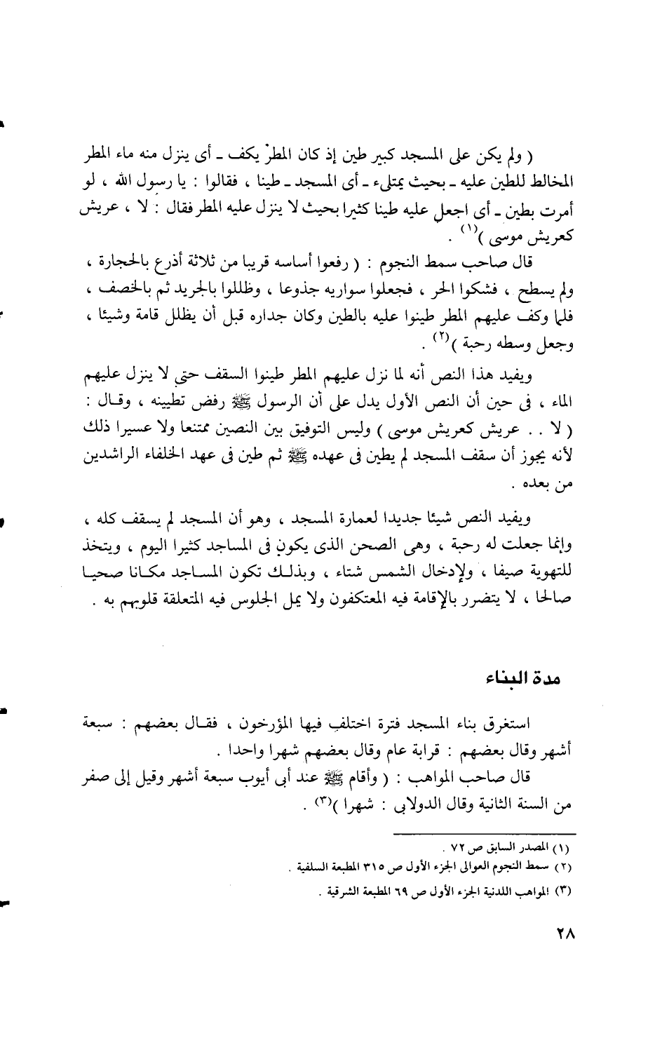 ويفيد هذا النص أنه لما نزل عليهم المطر طينوا السقف حتى لا ينزل عليهم الماء في حين أن النص الأول يدل على أن الرسول - صلى الله عليه وسلم - رفض تطيينه، وقال: (لا 00 عريش كعريش موسى) وليس التوفيق بين النصين ممتنعا ولا عسيرا ذلك لأنه يجوز أن سقف المسجد لم يطين في عهده - صلى الله عليه وسلم - ثم طين في عهد الخلفاء الراشدين من بعده.