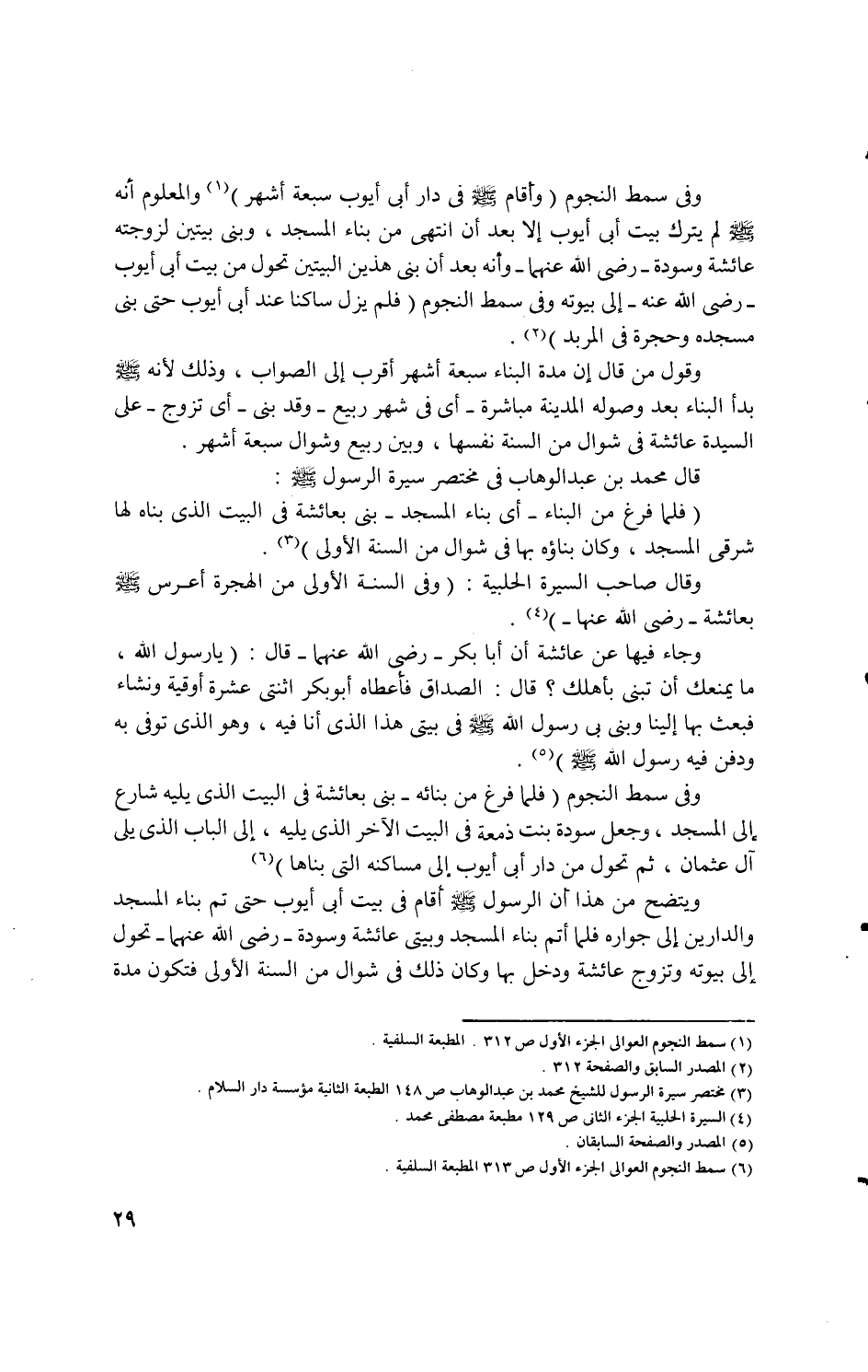 ... وفي سمط النجوم (فلما فرغ من بنائه ـ بنى بعائشة في البيت الذي يليه شارع إلى المسجد، وجعل سودة بنت ذمعة في البيت الآخر الذي يليه، إلى الباب الذي يلى آل عثمان، ثم تحول من دار أبى أيوب إلى مساكنه التي بناها). (58)