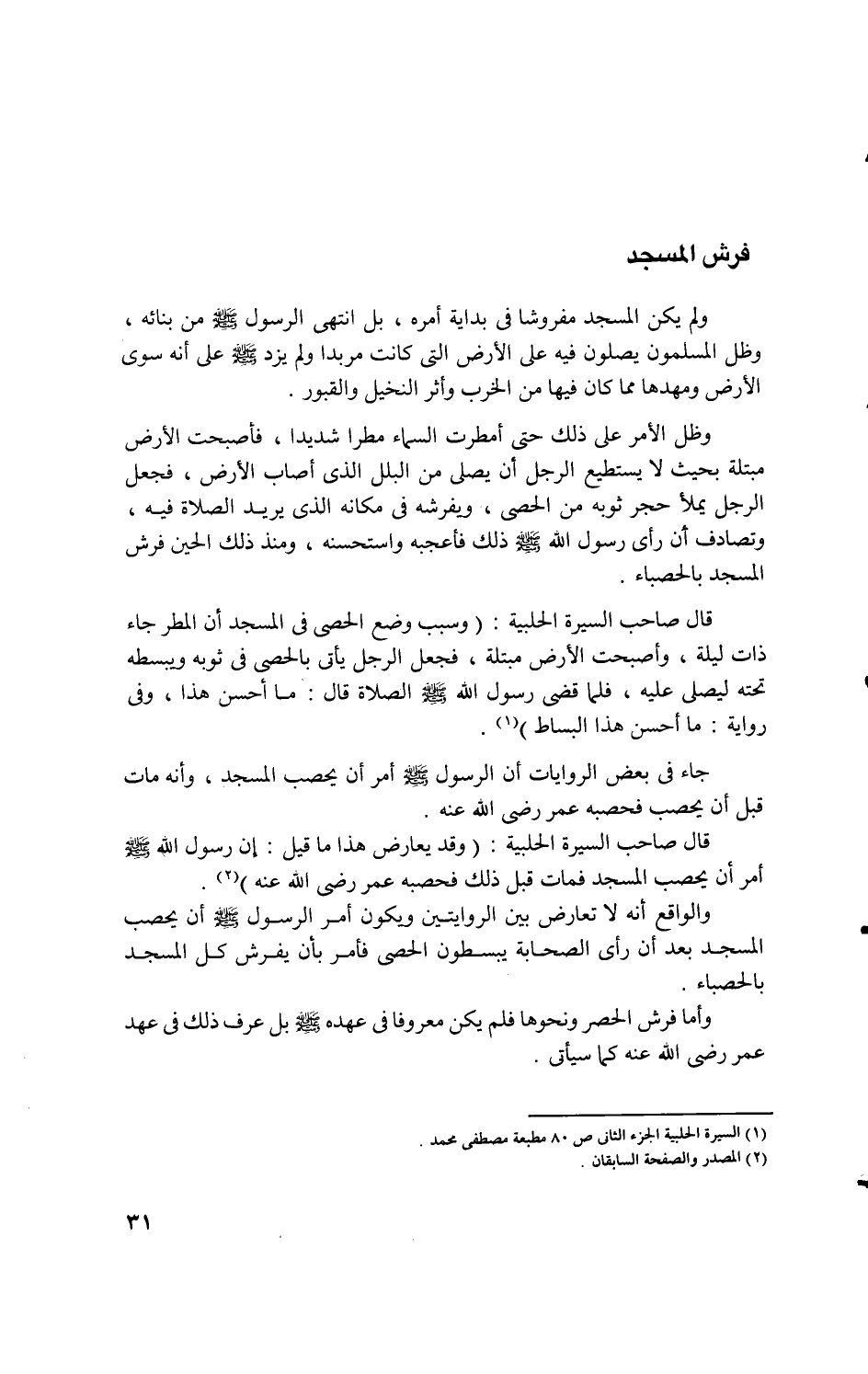 ... قال صاحب السيرة الحلبية: (وقد يعارض هذا ما قيل: إن رسول الله - صلى الله عليه وسلم - أمر أن يحصب المسجد فمات قبل ذلك فحصبه عمر رضي الله عنه) (66)