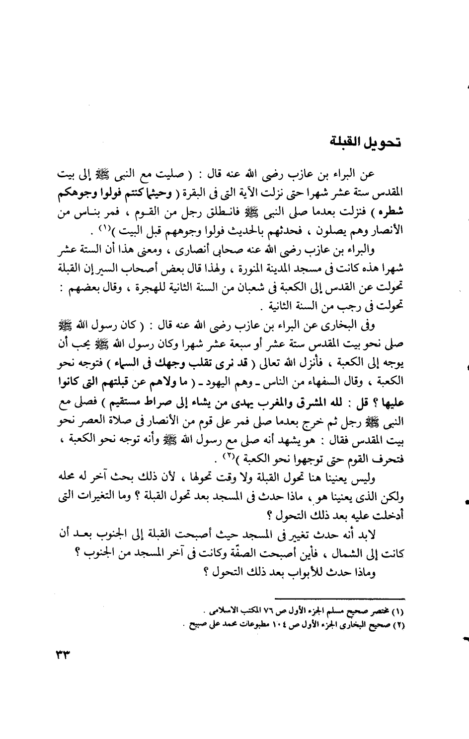 ... وفى البخارى عن البراء بن عازب رضى الله عنه قال: (كان رسول الله - صلى الله عليه وسلم - صلى نحو بيت المقدس ستة عشر أو سبعة عشر شهرا وكان رسول الله - صلى الله عليه وسلم - يحب أن يوجه إلى الكعبة، فأنزل الله تعالى (قد نرى تقلب وجهك في السماء) فتوجه نحو الكعبة، وقال السفهاء من الناس ـ وهم اليهود ـ (ما ولاهم عن قبلتهم التى كانوا عليها؟ قل: لله المشرق والمغرب يهدى من يشاء إلى صراط مستقيم) فصلى مع النبى - صلى الله عليه وسلم - رجل ثم خرج بعدما صلى فمر على قوم من الأنصار في صلاة العصر نحو بيت المقدس فقال: هو يشهد أنه صلى مع رسول الله - صلى الله عليه وسلم - وأنه توجه نحو الكعبة، فتحرف القوم حتى توجهوا نحو الكعبة) (1).