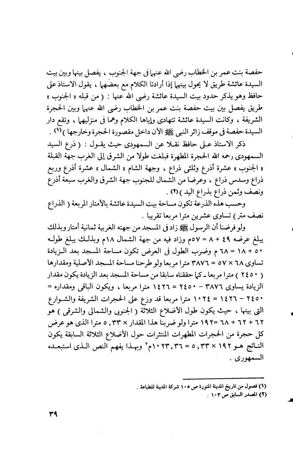 ... ولو فرضنا أن الرسول - صلى الله عليه وسلم - زاد في المسجد من جهته الغربية ثمانية أمتار وبذلك يبلغ عرضه 49+8= 57م وزاد فيه من جهة الشمال 18م وبذلك يبلغ طوله 50+18= 68م وضرب الطول في العرض تكون مساحة المسجد بعد الزيادة تساوى 68×57= 3876 مترا مربعا ولو طرحنا مساحة المسجد الأصلية ومقدارها (2450) مترا مربعا ـ كما حققناه سابقا من مساحة المسجد بعد الزيادة يكون مقدار الزيادة يساوى 3876 - 2450 = 1426 مترا مربعا، ويكون الباقي ومقداره = 2450 - 1426 = 1024 مترا مربعا قد وزع على الحجرات الشريفة والشوارع التى بينها، حيث يكون طول الأضلاع الثلاثة (الجنوبى والشمالى والشرقى) هو 62+62+68=192 مترا ولو ضربنا هذا المقدار ×5.33 مترا الذى هو عرض كل حجرة من الحجرات المطهرات المنثرات حول الأضلاع الثلاثة السابقة يكون الناتج هو 192 × 5.33 = 1023.36م 2 وبهذا يفهم النص الذى استبعده السمهورى.