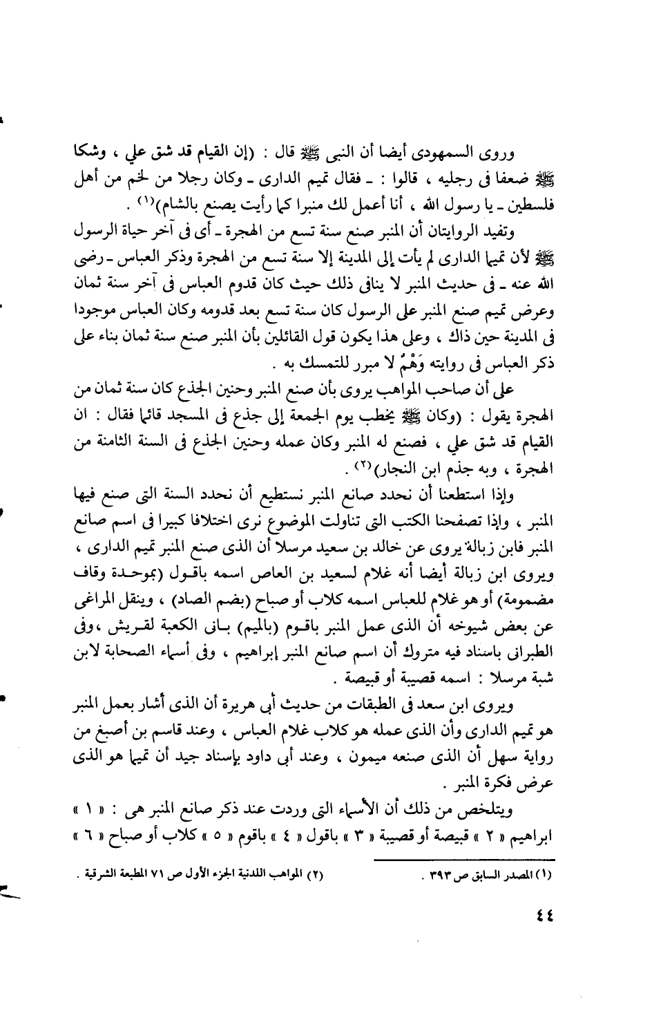 ... ويروى ابن سعد في الطبقات من حديث أبى هريرة أن الذى أشار بعمل المنبر هو تميم الدارى وأن الذى عمله هو كلاب غلام العباس، وعند قاسم ابن أصبغ من رواية سهل أن الذى صنعه ميمون، وعند أبى داود بإسناد جيد أن تميما هو الذى عرض فكرة المنبر.