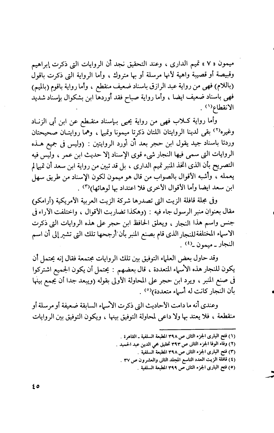 ... وفى مجلة قافلة الزيت التى تصدرها شركة الزيت العربية الأمريكية (أرامكو) مقال بعنوان منبر الرسول جاء فيه: (وهكذا تضاربت الأقوال، واختلفت الآراء في جنس واسم هذا النجار، ويعلق الحافظ ابن حجر على هذه الروايات التى ذكرت الاسماء المختلفة للنجار الذى قام بصنع المنبر بأن أرجحها تلك التى تشير إلى أن اسم النجار - ميمون - (4).