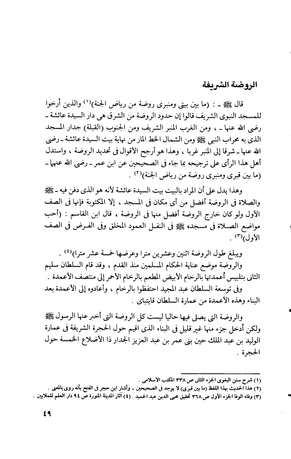... والروضة التى يصلى فيها حاليا ليست كل الروضة التى أخبر عنها الرسول - صلى الله عليه وسلم - ولكن أدخل جزء منها غير قليل في البناء الذى اقيم حول الحجرة الشريفة في عمارة الوليد بن عبد الملك حين بنى عمر بن عبد العزيز الجدار ذا الأضلاع الخمسة حول الحجرة.