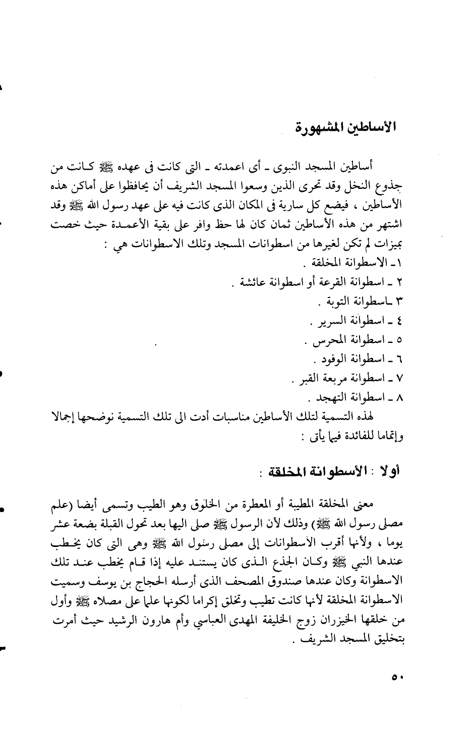 ... أساطين المسجد النبوى -أى أعمدته - التى كانت في عهده - صلى الله عليه وسلم - كانت من جذوع النخل وقد تحرى الذين وسعوا المسجد الشريف أن يحافظوا على أماكن هذه الأساطين، فيضع كل سارية في المكان الذى كانت فيه على عهد رسول الله - صلى الله عليه وسلم - وقد اشتهر من هذه الأساطين ثمان كان لها حظ وافر على بقية الأعمدة حيث خصت بميزات لم تكن لغيرها من اسطوانات المسجد وتلك الاسطوانات هي: