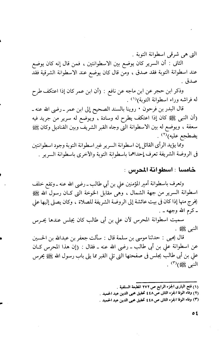 ... الثانى: أن السرير الذى يوضع بين الاسطوانتين، فمن قال إنه كان يوضع عند اسطوانة التوبة فقد صدق، ومن قال كان يوضع عند الاسطوانة الشرقية فقد صدق.