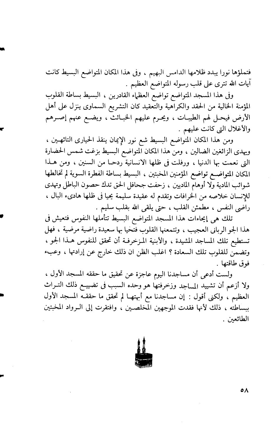 ... ولست أدعى أن مساجدنا اليوم عاجزة عن تحقيق ما حققه المسجد الأول، ولا أزعم أن تشييد المساجد وزخرفتها هو وحده السبب في تضييع ذلك التراث العظيم، ولكنى أقول: إن مساجدنا مع أبهتها لم تحقق ما حققه المسجد الأول ببساطته، ذلك لأنها فقدت الموجهين المخلصين، وافتقرت إلى الرواد المخبتين الطائعين.