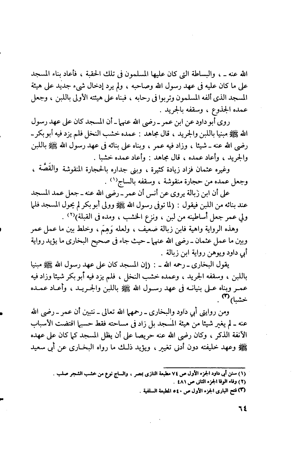 ... يقول البخارى: رحمه الله -: (إن المسجد كان في عهد رسول الله - صلى الله عليه وسلم - مبنيا باللبن، وسقفه الجريد، وعمده خشب النخل، فلم يزد فيه أبو بكر شيئا وزاد فيه عمر وبناه على بنيانه في عهد رسول الله - صلى الله عليه وسلم - باللبن والجريد، وأعاد عمده خشبا) (3).