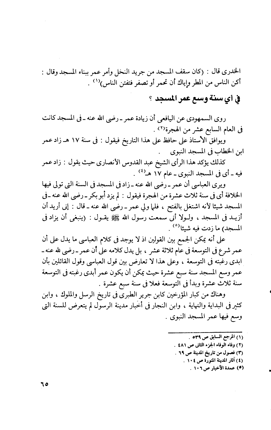 ... وهناك من كبار المؤرخين كابن جرير الطبرى في تاريخ الرسل والملوك، وابن كثير في البداية والنهاية، وابن النجار في أخبار مدينة الرسول لم يتعرض للسنة التى وسع فيها عمر المسجد النبوى.