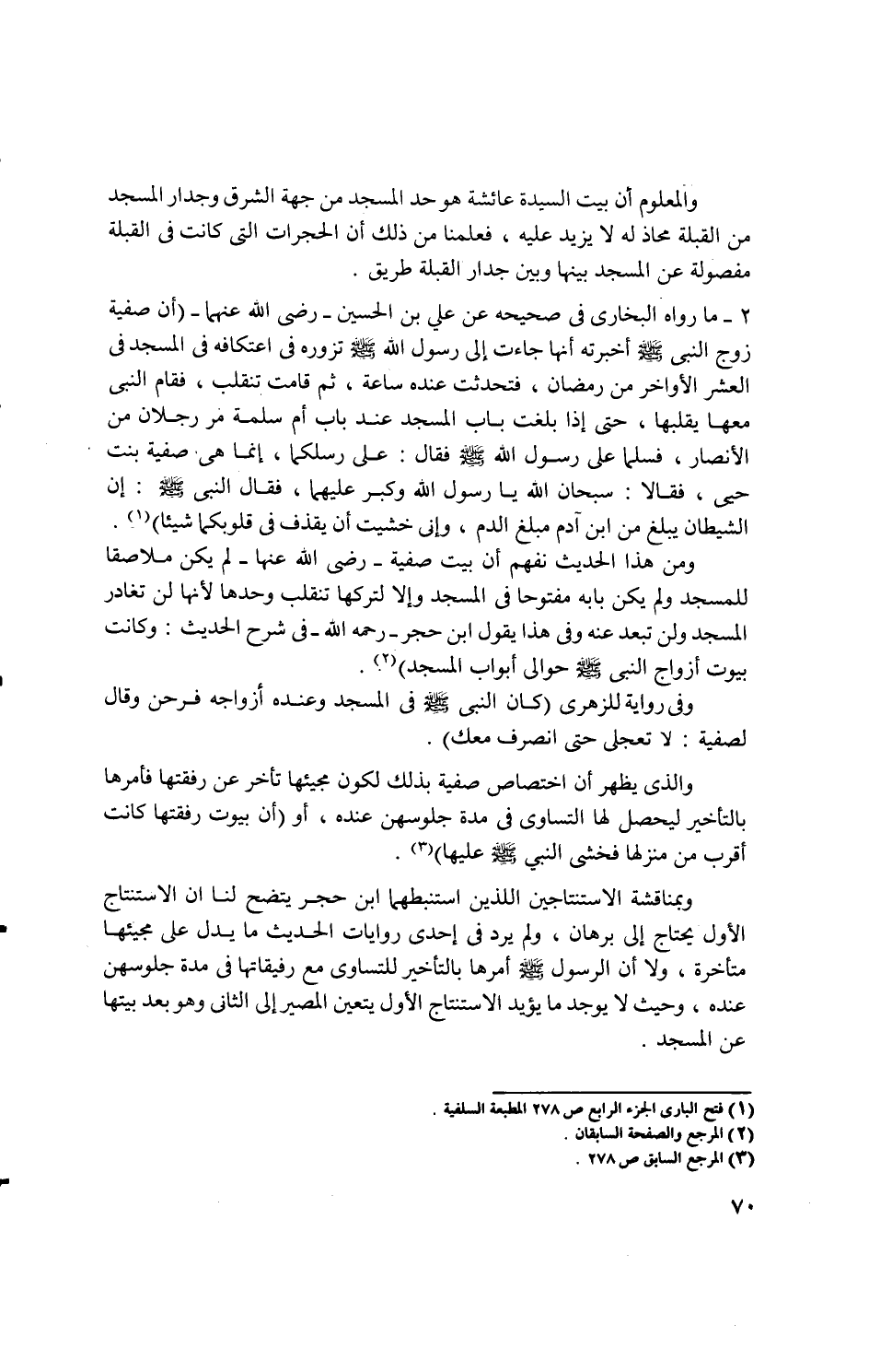 ... ومن هذا الحديث نفهم أن بيت صفية - رضى الله عنها - لم يكن ملاصقا للمسجد ولم يكن بابه مفتوحا في المسجد وإلا لتركها تنقلب وحدها لأنها لن تغادر المسجد ولن تبعد عنه وفى هذا يقول ابن حجر - رحمه الله - في شرح الحديث: وكانت بيوت أزواج النبى - صلى الله عليه وسلم - حوالى أبواب المسجد) (2).