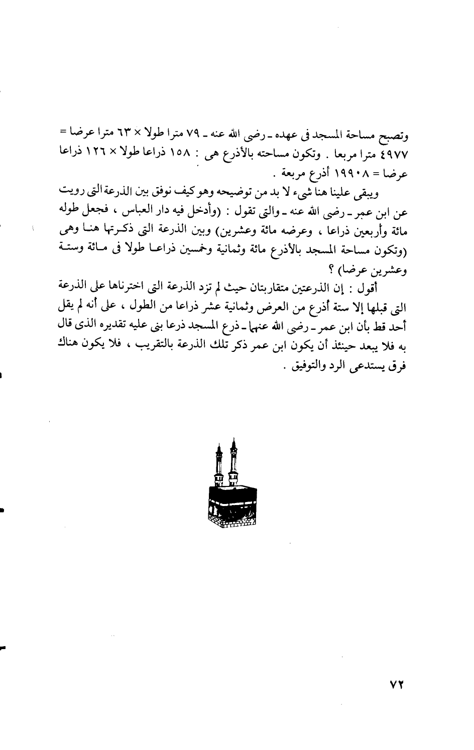 ... أقول: إن الذرعتين متقاربتان حيث لم تزد الذرعة التى اخترناها على الذرعة التى قبلها إلا ستة أذرع من العرض وثمانية عشر ذراعا من الطول، على أنه لم يقل أحد قط بأن ابن عمر - رضى الله عنهما - ذرع المسجد ذرعا بنى عليه تقديره الذى قال به فلا يبعد حينئذ أن يكون ابن عمر ذكر تلك الذرعة بالتقريب، فلا يكون هناك فرق يستدعى الرد والتوفيق.