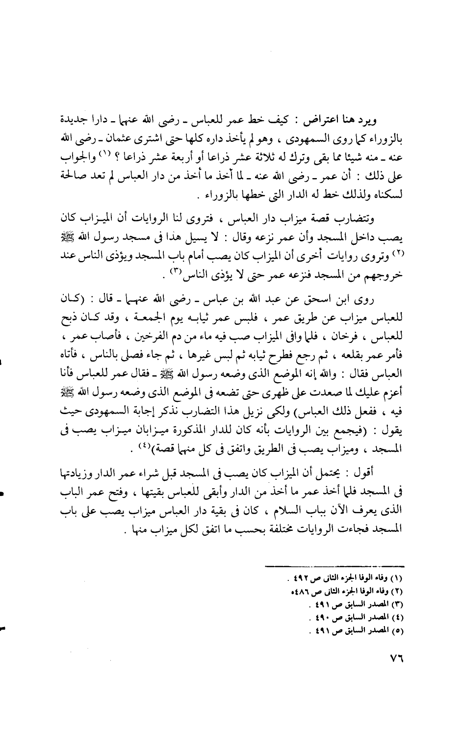ويرد هنا اعتراض: كيف خط عمر للعباس - رضى الله عنهما - دارا جديدة بالزوراء كما روى السمهودى، وهو لم يأخذ داره كلها حتى اشترى عثمان - رضى الله عنه - منه شيئا مما بقى وترك له ثلاثة عشر ذراعا أو أربعة عشر ذراعا؟ (1) والجواب على ذلك ان عمر - رضى الله عنه - لما أخذ ما أخذ من دار العباس لم تعد صالحة لسكناه ولذلك خط له الدار التى خطها بالزوراء.