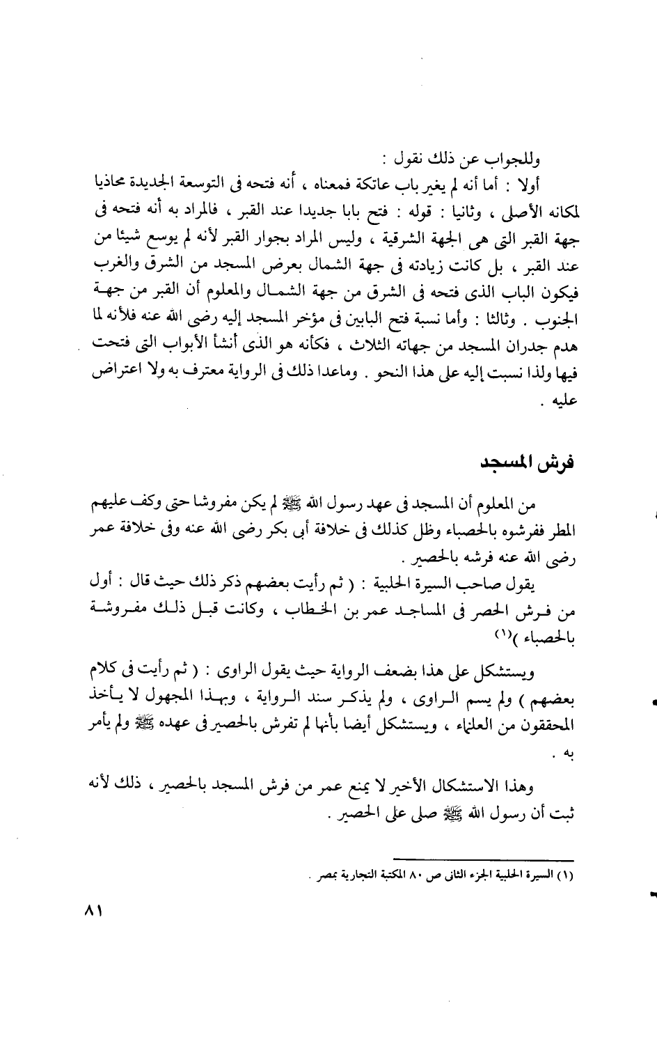... أولا: أما أنه لم يغير باب عاتكة فمعناه، أنه فتحه في التوسعة الجديدة محاذيا لمكانه الأصلى، وثانيا: قوله: فتح بابا جديدا عند القبر، فالمراد به أنه فتحه في جهة القبر التى هى الشرقية، وليس المراد بجوار القبر لأنه لم يوسع شيئا من عند القبر، بل كانت زيادته في جهة الشمال بعرض المسجد من الشرق والغرب فيكون الباب الذى فتحه في الشرق من جهة الشمال والمعلون أن القبر من جهة الجنوب. وثالثا: واما نسبة فتح البابين في مؤخر المسجد إليه رضى الله عنه فلأنه لما هدم جدارن المسجد من جهاته الثلاث، فكأنه هو الذى أنشأ الأبواب التى فتحت فيها ولذا نسبت إليه على هذا النحو. وما عدا ذلك في الرواية معترف به ولا اعتراض عليه.