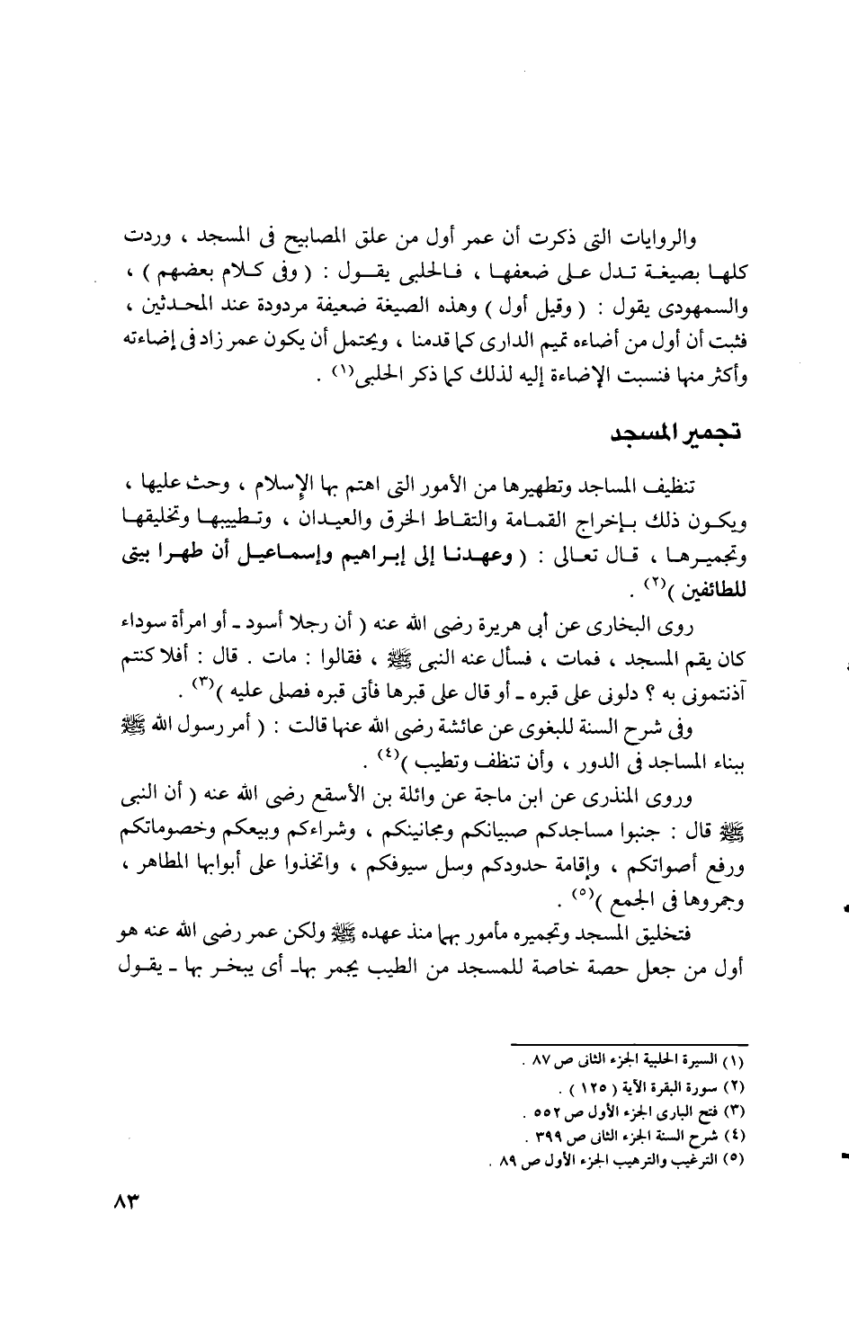 ... فتخليق المسجد وتجميره مأمور بهما منذ عهده - صلى الله عليه وسلم - ولكن عمر رضى الله عنه هو أول من جعل حصة خاصة للمسجد من الطيب يجمر بها- أى يبخر بها - يقول