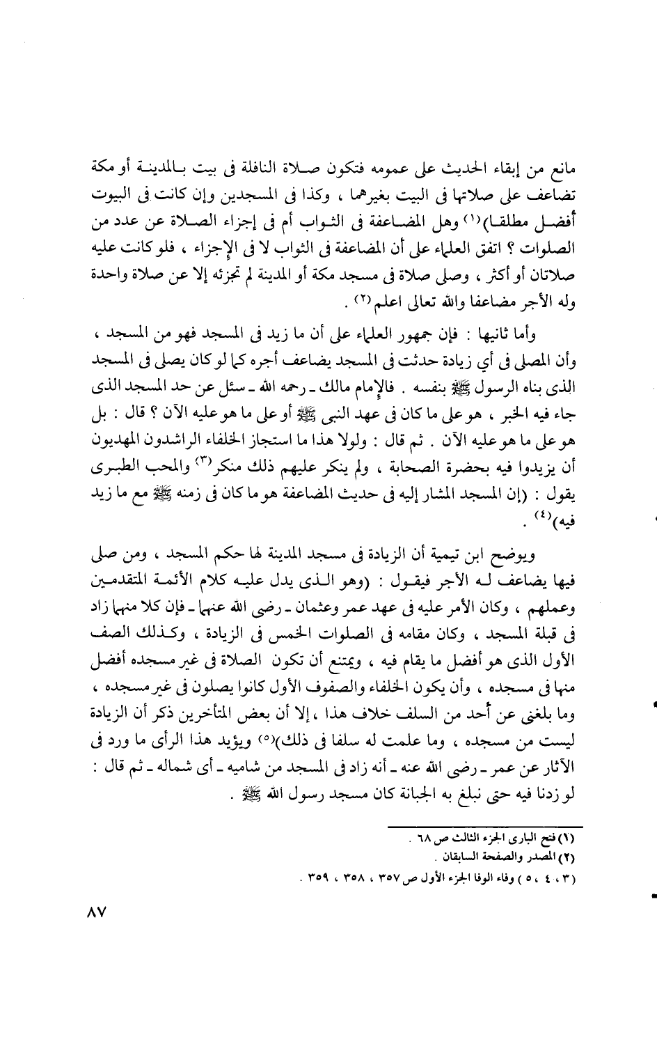 ... ويوضح ابن تيمية أن الزيادة في مسجد المدينة لها حكم المسجد، ومن صلى فيها يضاعف له الأجر فيقول: (وهو الذى يدل عليه كلام الأئمة المتقدمين وعملهم، وكان الأمر عليه في عهد وعثمان - رضى الله عنهما - فإن كلا منهما زاد في قبلة المسجد، وكان مقامه في الصلوات الخمس في الزيادة، وكذلك الصف الأول الذى هو أفضل ما يقام فيه، ويمتنع أن تكون الصلاة في غير مسجده أفضل منها في مسجده، وما بلغنى عن أحد من السلف خلاف هذا، إلا أن بعض المتأخرين ذكر أن الزيادة ليست من مسجده، وما علمت له سلفا في ذلك) (5) ويؤيد هذا الرأى ما ورد في الآثار عن عمر - رضى الله عنه - أنه زاد في المسجد من شاميه - أى شماله - ثم قال: لو زدنا فيه حتى نبلغ به الجبانة كان مسجد رسول الله - صلى الله عليه وسلم -.