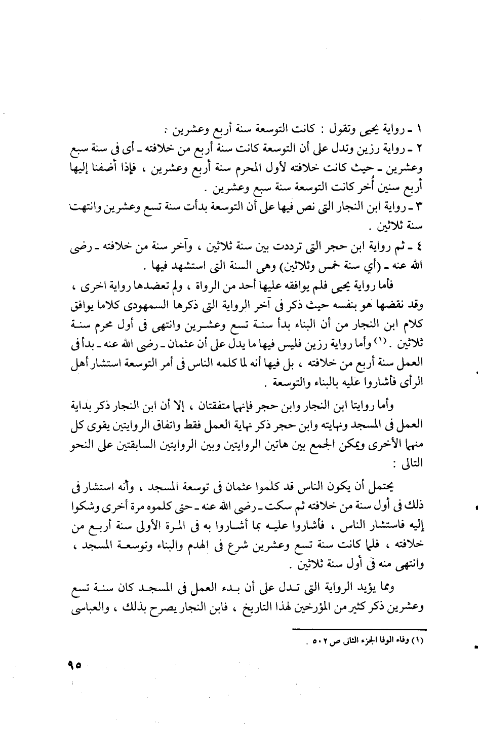 فأما رواية ابن حجر فلم يوافقه عليها أحد من الرواة، ولم تعضدها رواية أخرى وقد نقضها هو بنفسه حيث ذكر في آخر الرواية التى ذكرها السمهودى كلاما يوافق كلام ابن النجار من أن البناء بدأ سنة تسع وعشرين وانتهى في أول محرم سنة ثلاثين. (1) وأما رواية رزين فليس فيها ما يدل على أن عثمان - رضى الله عنه - بدأ في العمل سنة أربع من خلافته، بل فيها أنه لما كلمه الناس في أمر التوسعة استشار أهل الرأى فأشاروا عليه بالبناء والتوسعة.