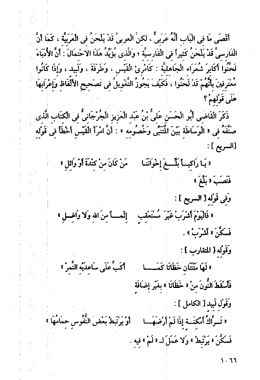 ذكر القاضي أبو الحسن علي بن عبدالعزيز الجرجاني في الكتاب الذي صنفه في (الوساطة بين المتنبي وخصومه): أن امرأ القيس أخطأ في قوله [السريع]: